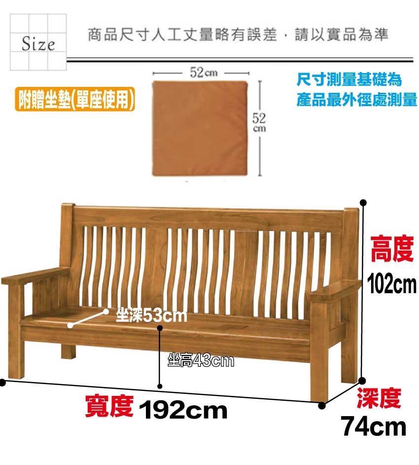 產品名稱:艾璞樟木色三人座柚木實木椅 - 尺寸:(寬)192x(深)74x(高)102/公分