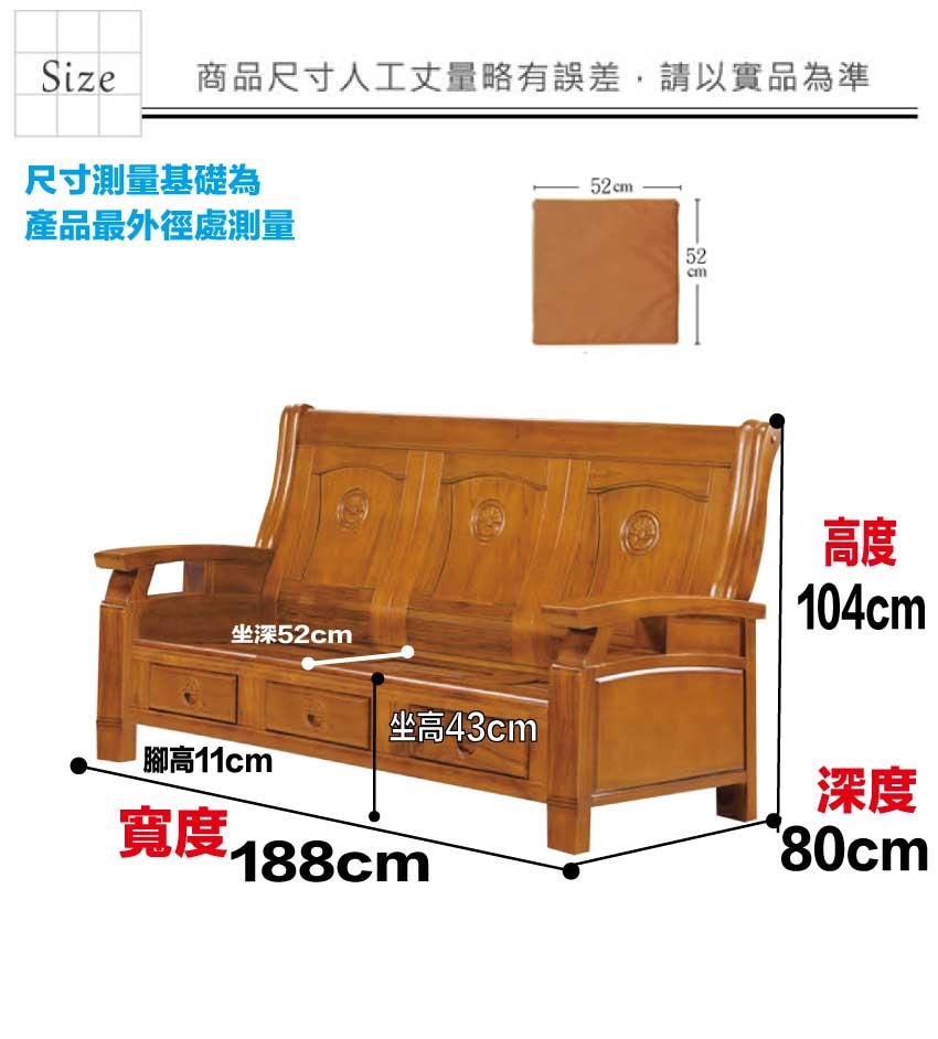 產品名稱:【綠家居】巴戈柚木色三人座實木椅(底部抽屜可收納) - 尺寸:(寬)188x(深)80x(高)104/公分