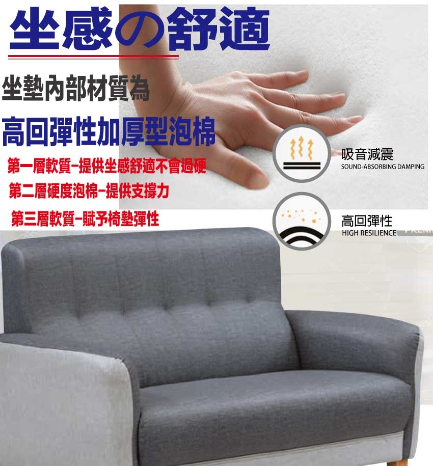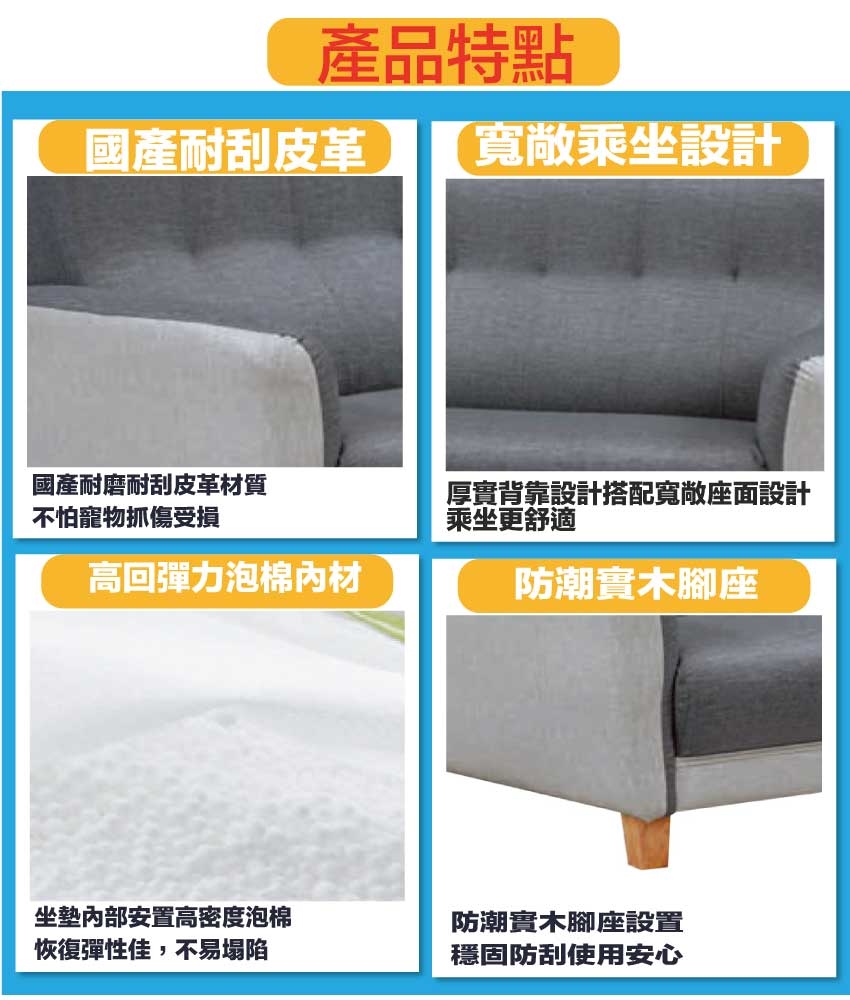 採用內部實木框架+實木造型腳座+耐磨耐刮皮革+高回彈泡棉等安心材質製造
