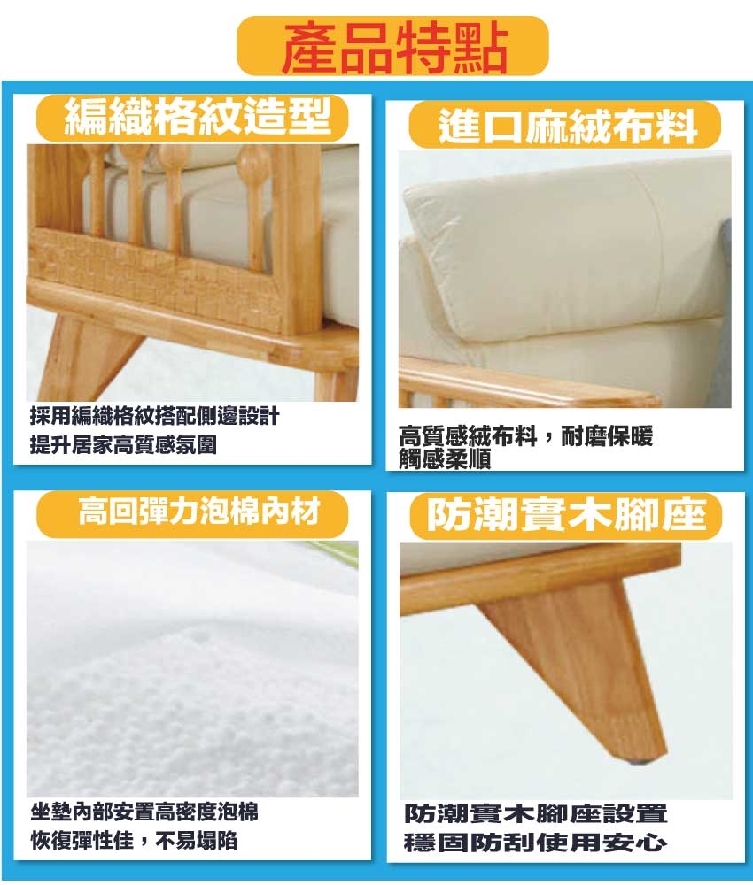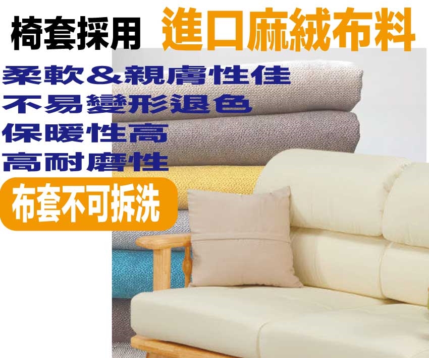 橡膠木實木+實木腳座&防刮腳粒+透氣麻絨布+高回彈力泡棉等安心材質製造