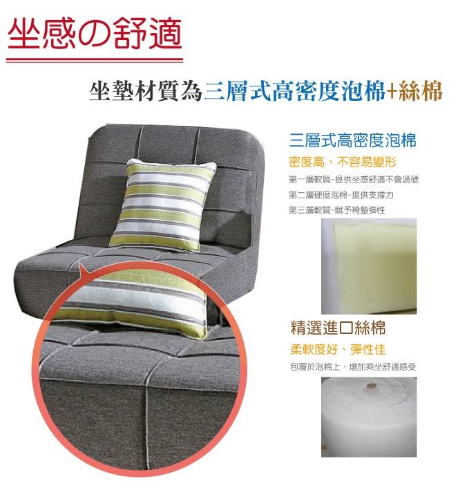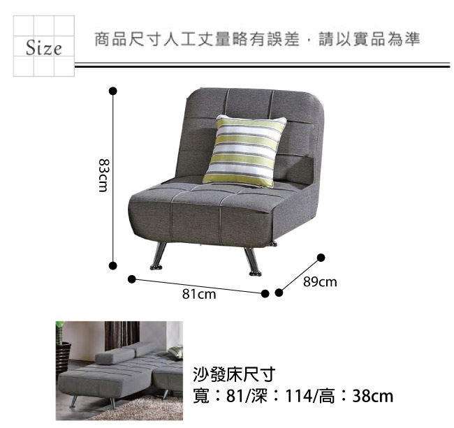 材質 | ◆產品名稱: 【綠家居】皮諾 時尚灰可拆洗棉麻布單人座沙發椅/沙發床 產品尺寸: 沙發尺寸:(寬)81x(深)89x(高)83/公分 沙發床尺寸:(內坐墊寬)81x(深)114x(坐墊高)39/公分 材質:桐木實木骨架&不銹鋼五金結構+防鏽五金腳座 布料:可拆洗棉麻布 坐墊:三層式高密度泡棉+絲棉
