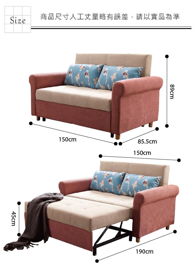 材質 | ◆產品名稱: 【綠家居】恩德 拉合式可拆洗棉麻布沙發椅/沙發床 產品尺寸: 沙發尺寸:(寬)150x(深)85.5x(椅背高)89/公分 沙發床尺寸:(寬)150x(深)190x(坐墊高)45/公分 材質:桐木實木&鋼管骨架+不銹鋼五金結構+實木&防鏽黑漆腳座 布料:可拆洗棉麻布 坐墊:三層式高密度泡棉+絲棉