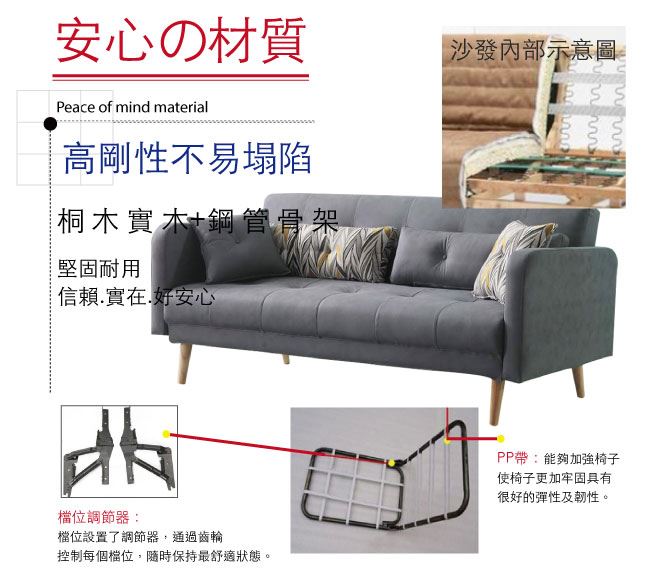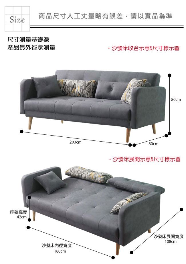 材質 | ◆產品名稱: 【綠家居】卡伯恩 時尚灰透氣棉滌布沙發椅/沙發床/沙發床(展開式機能設計) 產品尺寸: 收合尺寸:(寬)203x(深)80x(高)80/公分 展開尺寸:(內寬)180x(深)108x(坐高)42/公分 材質:桐木實木骨架椅身+防潮實木腳座 布料:加厚透氣棉滌布料 坐墊:三層式高密度泡棉+絲棉