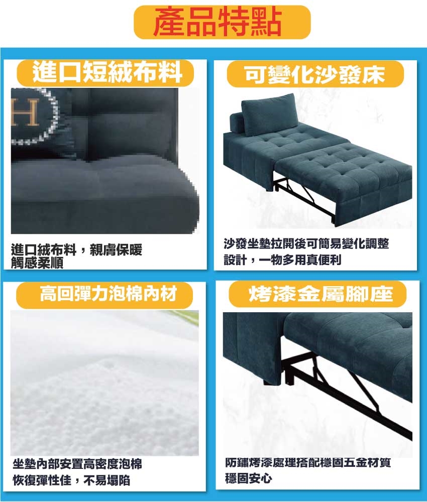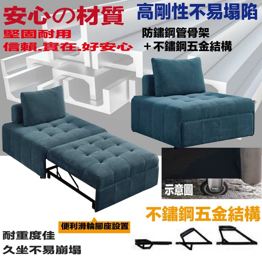 採用防鏽鋼管結構&不鏽鋼五金結構+便利滑輪設置+高回彈力加厚泡棉+進口短絨布等安心材質