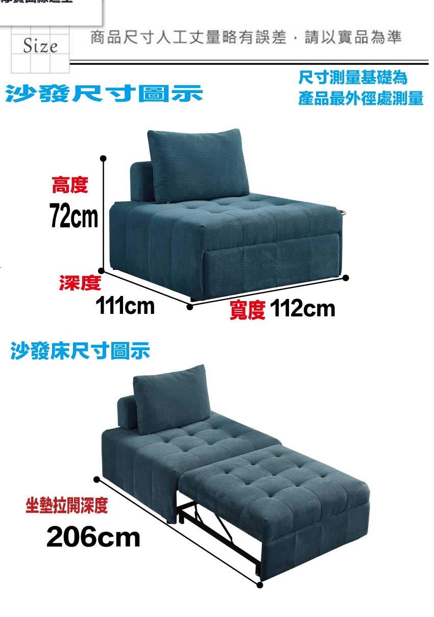 沙發床尺寸:(坐墊寬)112x(深)206x(高)72公分