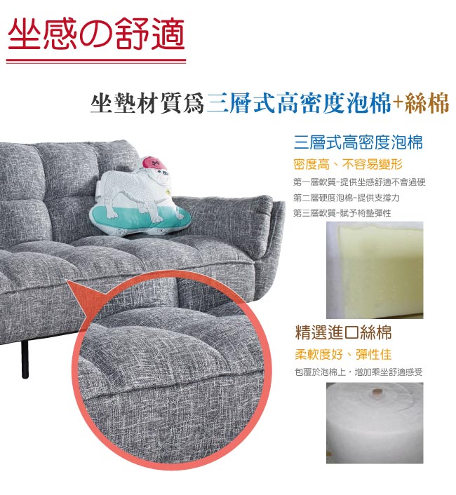 可拆洗亞麻布+高密度泡棉+絲綿等材質,坐感舒適