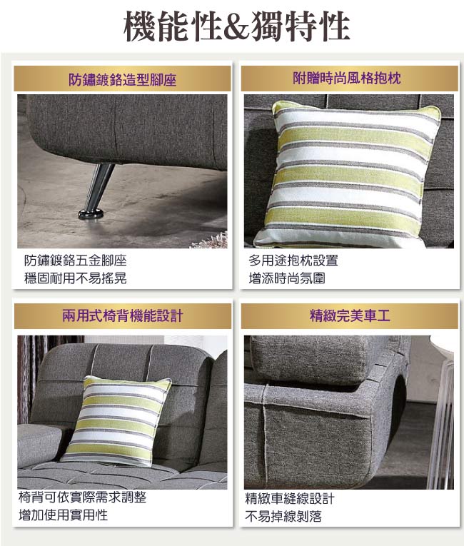 【綠家居】亞當 時尚灰亞麻布二用L型沙發/沙發床組合(分段式機能設計) 表面採用可拆洗亞麻布材質製作,質感細緻、耐用年限長,以時尚亮彩的灰色系,呈現出經典格調,加上優雅的縫線設計巧妙融合,打造出獨特時尚感;防鏽鍍烙腳座,堅固耐重,分段式開合椅身設計可瞬間調整L型沙發變成沙發床功能,無論坐或躺都能自在開合出舒適的角度,讓你身心放鬆又能隨心所欲改造不同的空間擺設。桐木實木椅身+不鏽鋼五金結構+高密度泡棉+絲綿等材質,柔軟厚實有彈性,軟硬適中不鬆軟塌陷,實用機能性設計,兼具沙發和沙發床的居家雙重功用 【綠家居】亞當 時尚灰亞麻布二用L型沙發/沙發床組合(分段式機能設計) 讓您體驗別有韻味的時尚色彩!