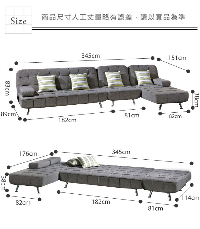 沙發床尺寸:(寬)345x (深)176x (高)38 公分