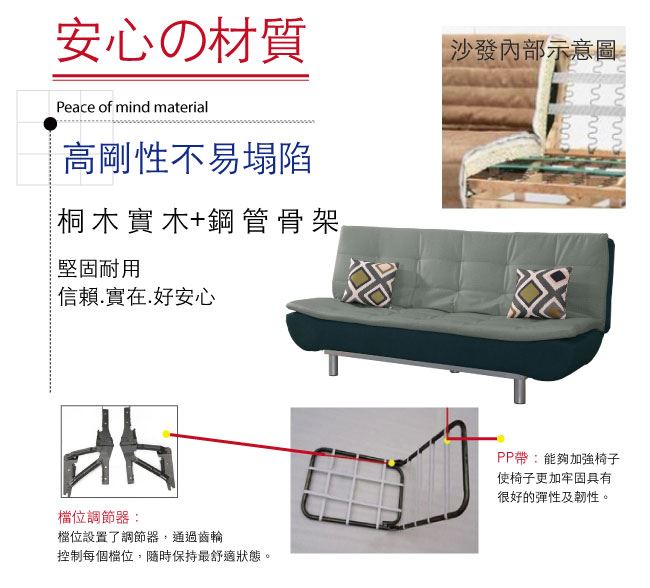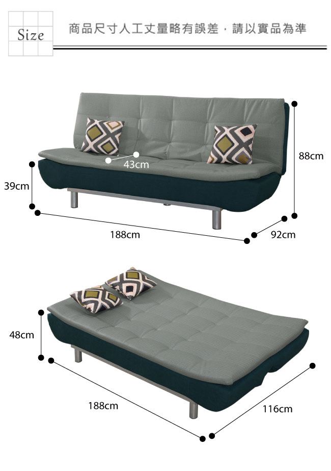 材質 | ◆產品名稱:【綠家居】 科塞 現代雙色機能貓抓皮革沙發/沙發床(沙發/沙發床二用+展開式機能設計) 產品尺寸: 沙發:(寬)188x(深)92x(高)88/ 公分 沙發床:(寬)188x(深)116x(坐墊高)48/ 公分 材質:桐木實木&防鏽鋼管骨架+不銹鋼五金結構+防鏽五金腳座 皮革:耐磨貓抓皮革+透氣亞麻布 坐墊:三層式高密度泡棉+絲棉 |
