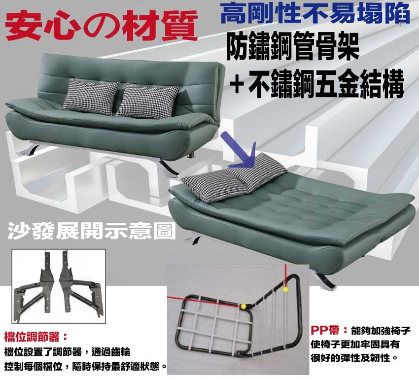 防鏽鋼管骨架+透氣柔韌皮革+不銹鋼五金結構+鍍烙金屬腳座+雙層加厚高回彈力泡棉等安心材質製造