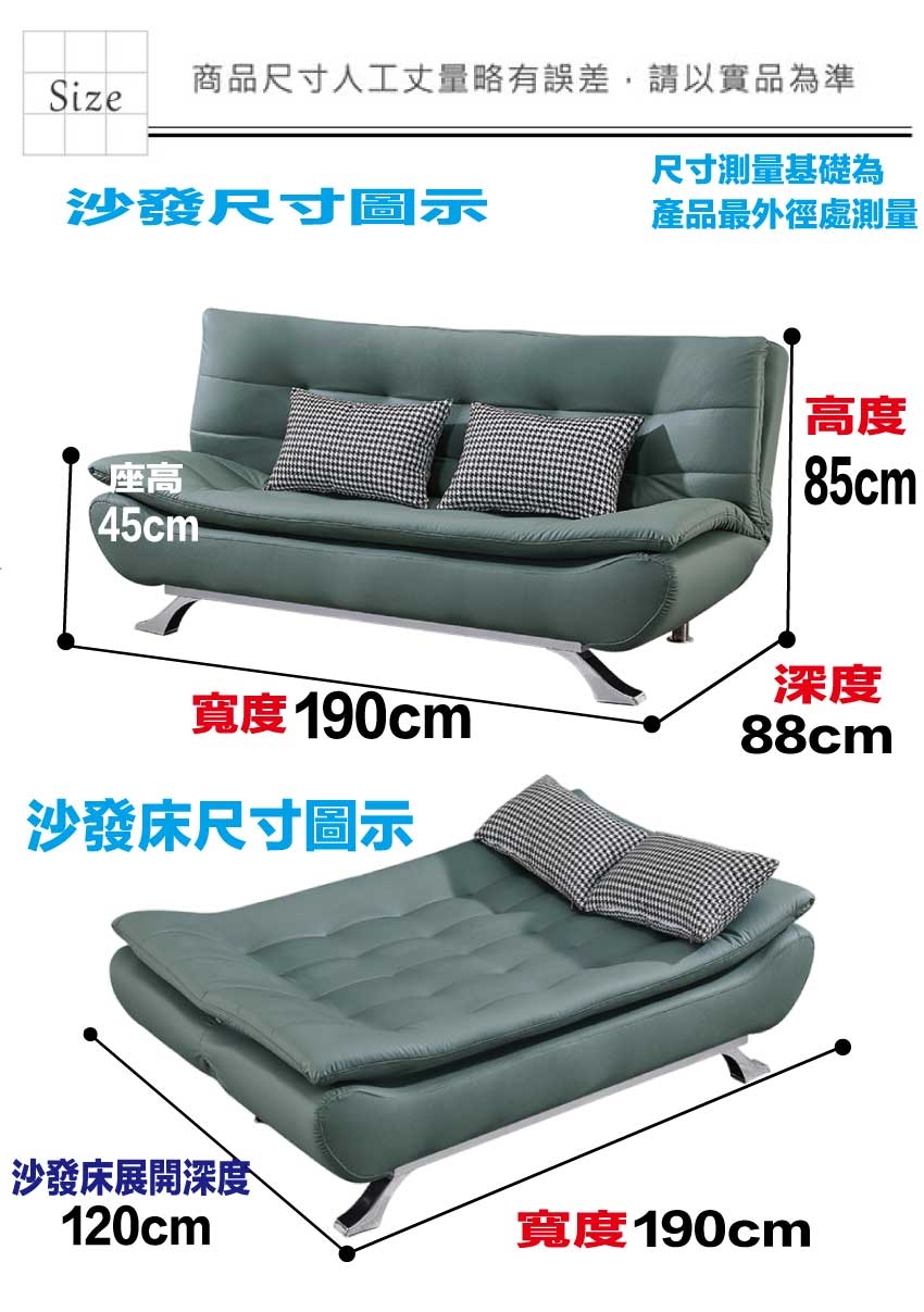 沙發床:(寬)190x(深)120x(坐墊高)45/ 公分