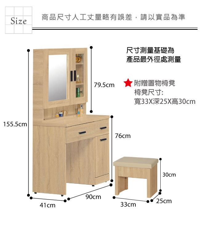 材質 | ◆產品名稱:【綠家居】廷布 現代3尺開合式鏡台/化妝台(含椅(含化妝椅) 產品尺寸: 尺寸:(寬)90x(深)41x(高)155.5/公分 ◆材質: 材質:防蛀木心板 材質:五金滑軌結構+強化玻璃鏡面 塗漆:優利坦三層全包式耐磨塗漆塗裝處理 |