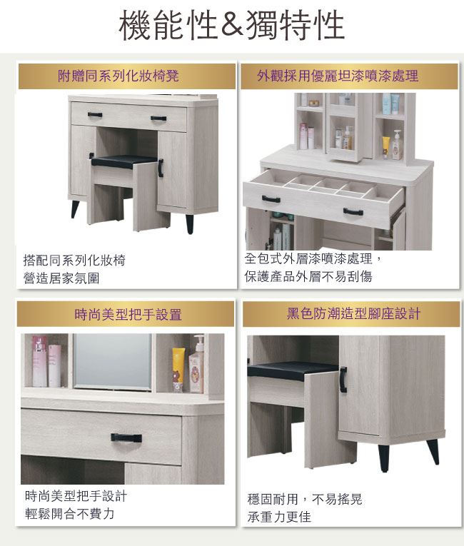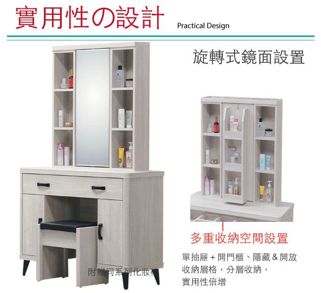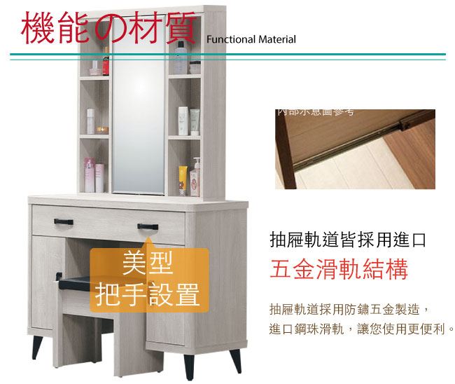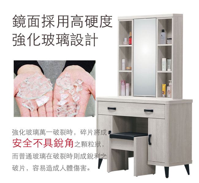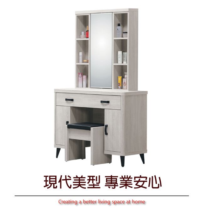 商品介紹 | 【綠家居】蓋爾達 現代3.2尺旋轉式鏡台/化妝台組合(含化妝椅) 橡木紋色系+現代簡約風格+安心材質製造,鏡台整體採用防蛀木心板+五金滑軌結構+強化玻璃鏡面+防潮黑漆腳座等安心材質製造,外層採用優利坦全包式耐磨噴漆處理搭配開合式鏡面+開門櫃+單抽屜+開放式&隱藏式收納等收納設計,全由專人配送到家,專業安心服務,替你省下更多時間! 【商品特色】 橡木紋色系+現代簡約風格+安心材質製造,使用放心+搭配居家更便利 鏡台採用防蛀木心板+五金滑軌結構+強化玻璃鏡面+防潮黑漆腳座等安心材質製造 旋轉式鏡面+開門櫃+單抽屜+開放式&隱藏式收納等收納設計 此商品不需要DIY組立,此商品為組立後之成品 品質保證、專業設計、貼心服務 全由專人配送到家,專業安心服務,替您省下更多時間 |