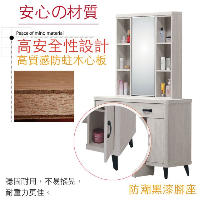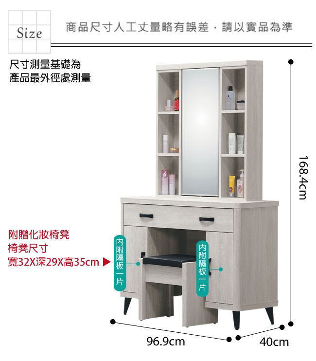 材質 | ◆產品名稱:【綠家居】蓋爾達 現代3.2尺旋轉式鏡台/化妝台組合(含化妝椅) 產品尺寸: 尺寸:(寬)96.9x(深)40x(高)168.4/公分 ◆材質: 材質:防蛀木心板+防潮黑漆腳座 材質:五金滑軌結構+強化玻璃鏡面 塗漆:優利坦全包式耐磨噴漆處理 |