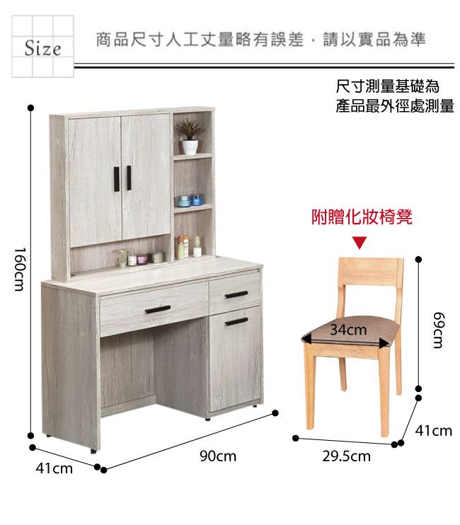 材質 | ◆產品名稱: 【綠家居】卡佐 橡木紋3尺開合式鏡台/化妝台組合(含化妝椅) 產品尺寸: 尺寸:(寬)90x(深)41x(高)160/公分 ◆材質: 材質:防蛀木心板+防潮耐磨腳座 材質:五金滑軌結構+強化玻璃鏡面 塗漆:優利坦全包式耐磨噴漆處理