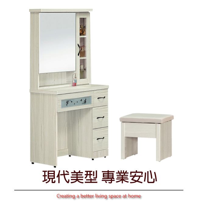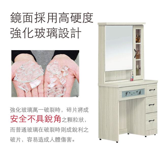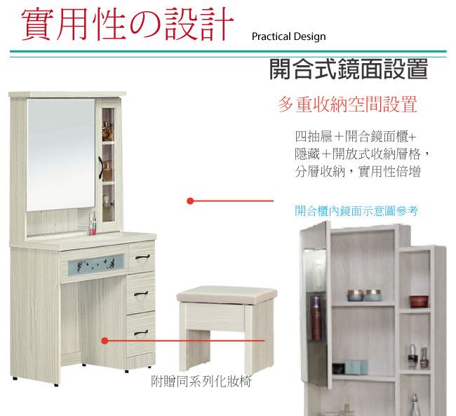 商品介紹 | 【綠家居】艾芬蘭 雪松3尺開合式鏡台/化妝台組合(含化妝椅) 雪松木紋色系+現代簡約風格+安心材質製造,鏡台整體採用防蛀木心板+五金滑軌結構+強化玻璃鏡面+防潮耐磨腳座等安心材質製造,外層採用優利坦全包式耐磨噴漆處理搭配開合式鏡面櫃+開門櫃+四抽屜+開放&隱藏式收納等收納設計,全由專人配送到家,專業安心服務,替你省下更多時間! 【商品特色】 雪松木紋色系+現代簡約風格+安心材質製造,使用放心+搭配居家更便利 鏡台採用防蛀木心板+五金滑軌結構+強化玻璃鏡面+防潮耐磨腳座等安心材質製造 開合式鏡面櫃+開門櫃+四抽屜+開放&隱藏式收納等收納設計 此商品不需要DIY組立,此商品為組立後之成品 品質保證、專業設計、貼心服務 全由專人配送到家,專業安心服務,替您省下更多時間 |
