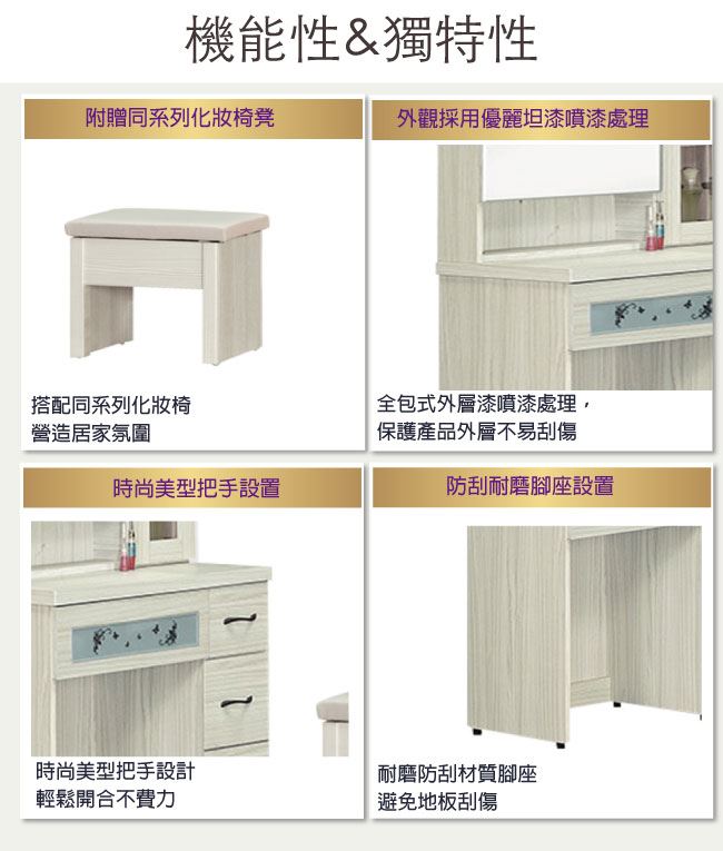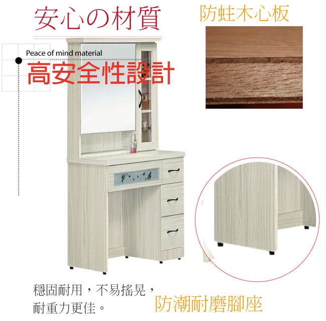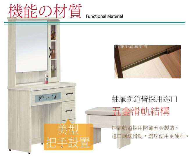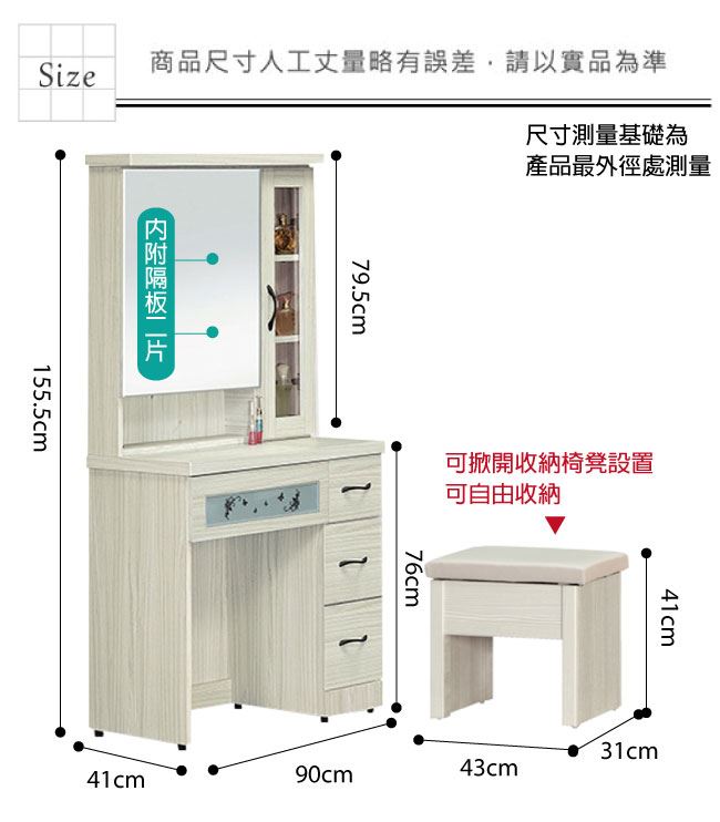材質 | ◆產品名稱: 【綠家居】艾芬蘭 雪松3尺開合式鏡台/化妝台組合(含化妝椅) 產品尺寸: 尺寸:(寬)90x(深)41x(高)155.5/公分 ◆材質: 材質:防蛀木心板+防潮耐磨腳座 材質:五金滑軌結構+強化玻璃鏡面 塗漆:優利坦全包式耐磨噴漆處理