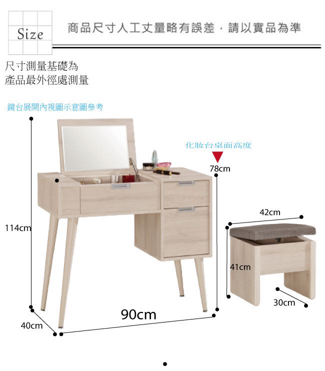 材質 | ◆產品名稱: 【綠家居】艾嘉柏 上掀式3尺鏡台/化妝台組合(鏡台+化妝椅) 產品尺寸: 尺寸:(寬)90x(深)40x(高)78-114/公分 ◆材質: 材質:防蛀木心板+防潮實木腳座 材質:五金滑軌結構+強化玻璃鏡面 塗漆:優利坦全包式耐磨噴漆處理
