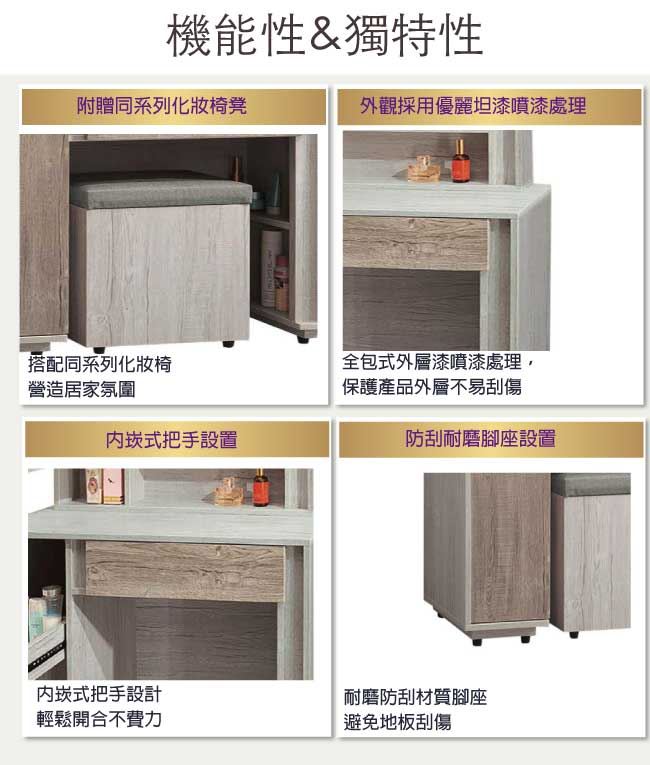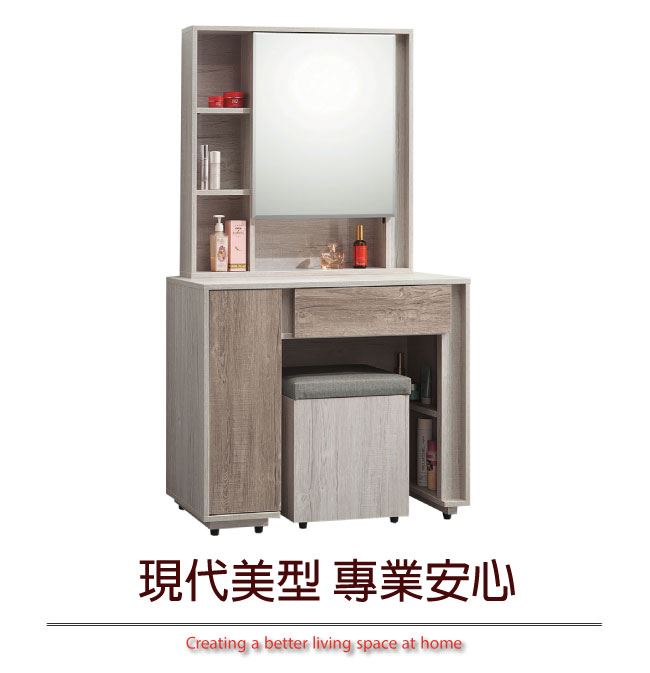 商品介紹 | 【綠家居】提韋克 時尚3尺開合式鏡台/化妝台組合(含化妝椅) 橡木紋雙色系+現代簡約風格+安心材質製造,鏡台整體採用防蛀木心板+五金滑軌結構+強化玻璃鏡面+防潮耐磨腳座等安心材質製造,外層採用優利坦全包式耐磨噴漆處理搭配開合式鏡面櫃+單抽屜+開合櫃+開放式&隱藏式收納等收納設計,全由專人配送到家,專業安心服務,替你省下更多時間! 【商品特色】 橡木紋雙色系+現代簡約風格+安心材質製造,使用放心+搭配居家更便利 鏡台採用防蛀木心板+五金滑軌結構+強化玻璃鏡面+防潮耐磨腳座等安心材質製造 開合式鏡面櫃+單抽屜+開合櫃+開放式&隱藏式收納等收納設計 此商品不需要DIY組立,此商品為組立後之成品 品質保證、專業設計、貼心服務 全由專人配送到家,專業安心服務,替您省下更多時間 |