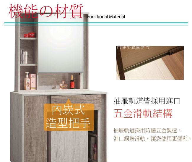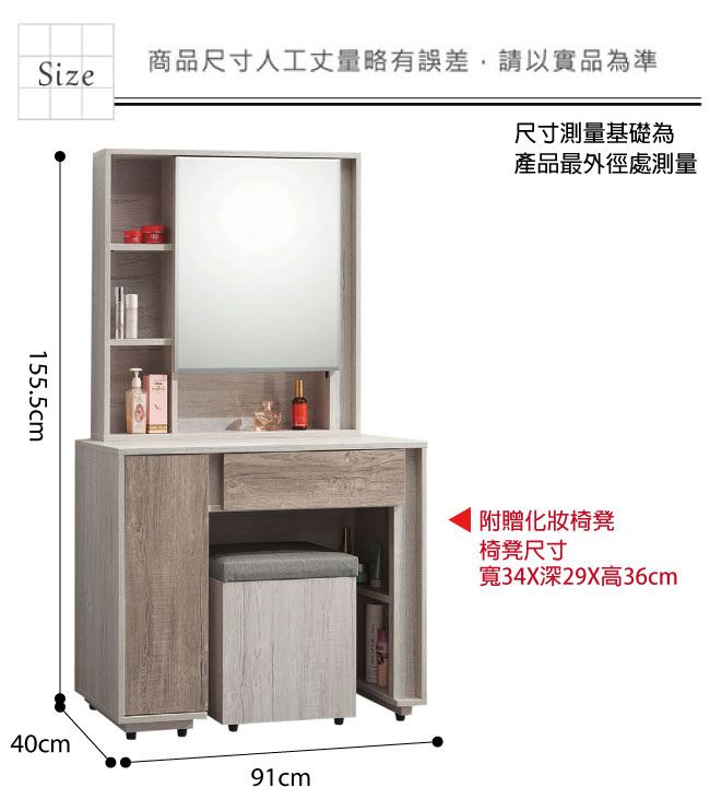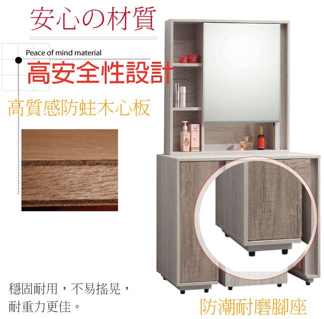 材質 | ◆產品名稱: 【綠家居】提韋克 時尚3尺開合式鏡台/化妝台組合(含化妝椅) 產品尺寸: 尺寸:(寬)91x(深)40x(高)155.5/公分 ◆材質: 材質:防蛀木心板+防潮耐磨腳座 材質:五金滑軌結構+強化玻璃鏡面 塗漆:優利坦全包式耐磨噴漆處理