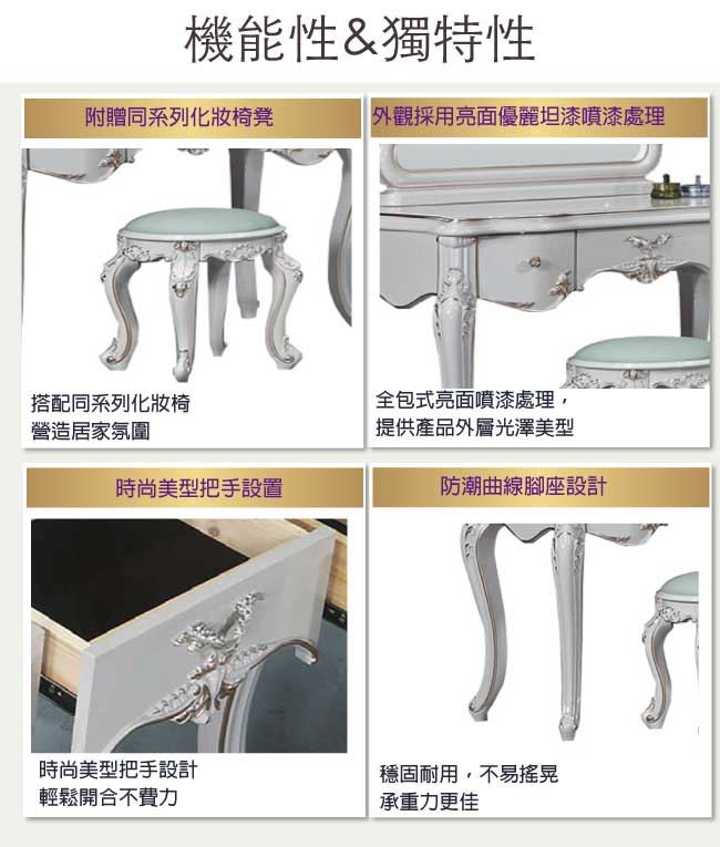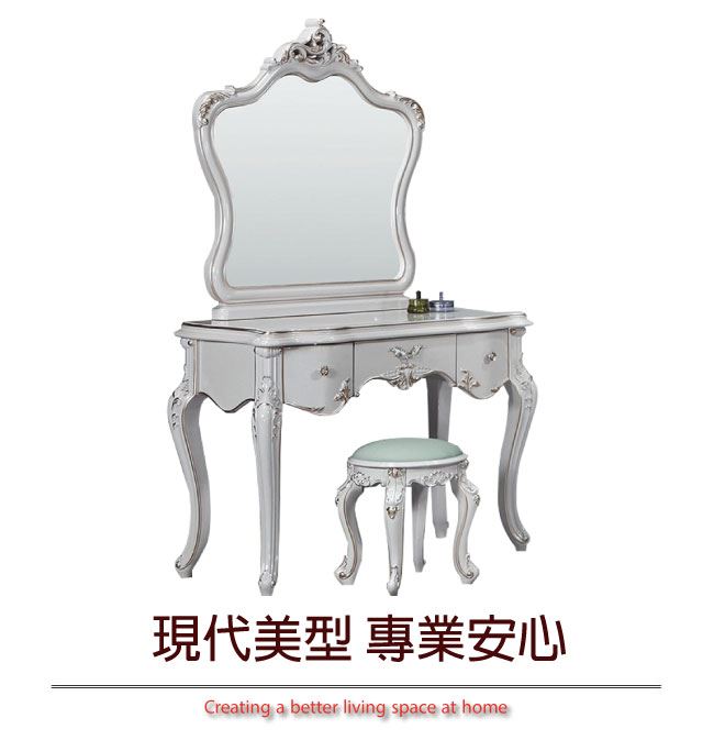 商品介紹 | 【綠家居】安蒂 法式白3.3尺立鏡式鏡台/化妝台組合(含化妝椅) 法式白色系+現代簡約風格+安心材質製造,鏡台整體採用防潮MDF板材+松木實木+曲線造型腳座+五金滑軌結構+強化玻璃鏡面等安心材質製造,外層採用優利坦全包式亮面噴漆處理搭配固定式鏡面+三抽屜+開放式桌面收納等收納設計,全由專人配送到家,專業安心服務,替你省下更多時間! 【商品特色】 法式白色系+現代簡約風格+安心材質製造,使用放心+搭配居家更便利 鏡台採用防潮MDF板材+松木實木+曲線造型腳座+五金滑軌結構+強化玻璃鏡面等安心材質製造 固定式鏡面+三抽屜+開放式桌面收納等收納設計 此商品不需要DIY組立,此商品為組立後之成品 品質保證、專業設計、貼心服務 全由專人配送到家,專業安心服務,替您省下更多時間 |