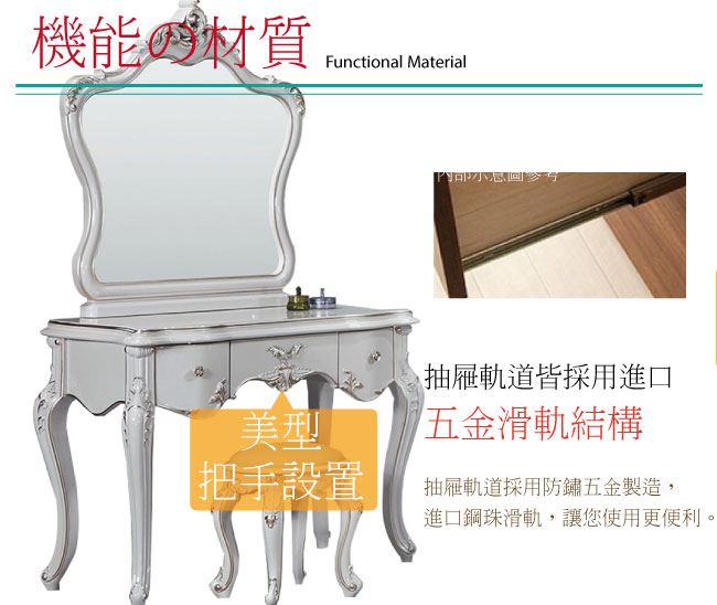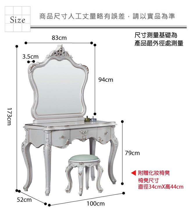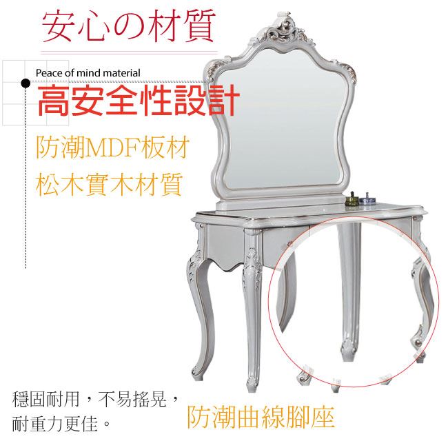 材質 | ◆產品名稱: 【綠家居】安蒂 法式白3.3尺立鏡式鏡台/化妝台組合(含化妝椅) 產品尺寸: 尺寸:(寬)100x(深)52x(高)173/公分 ◆材質: 材質:防潮MDF板材+松木實木+曲線造型腳座 材質:五金滑軌結構+強化玻璃鏡面 塗漆:優利坦全包式亮面噴漆處理