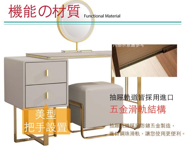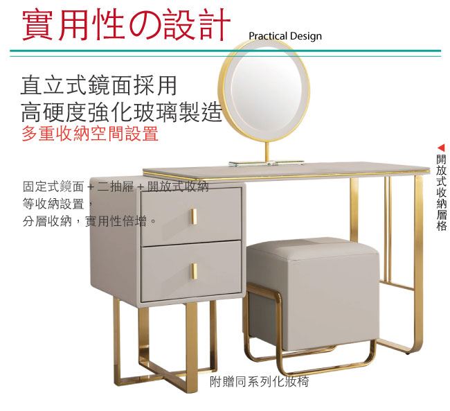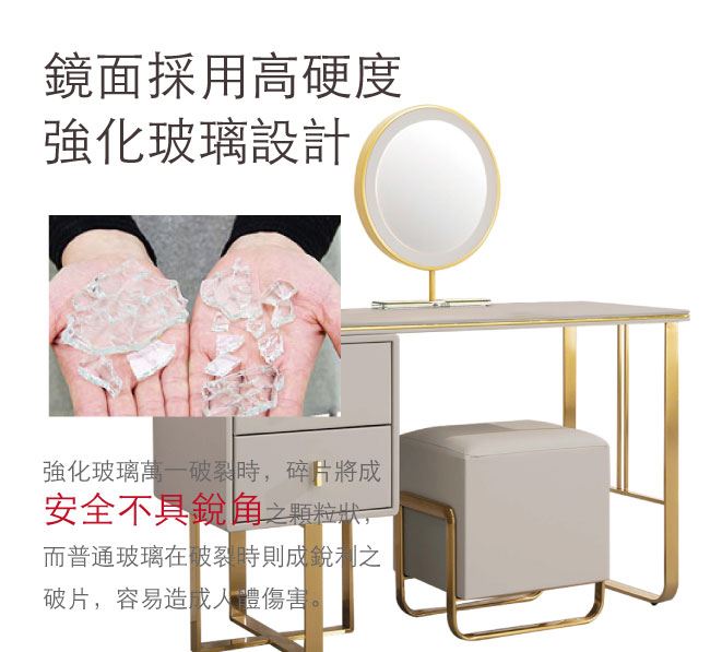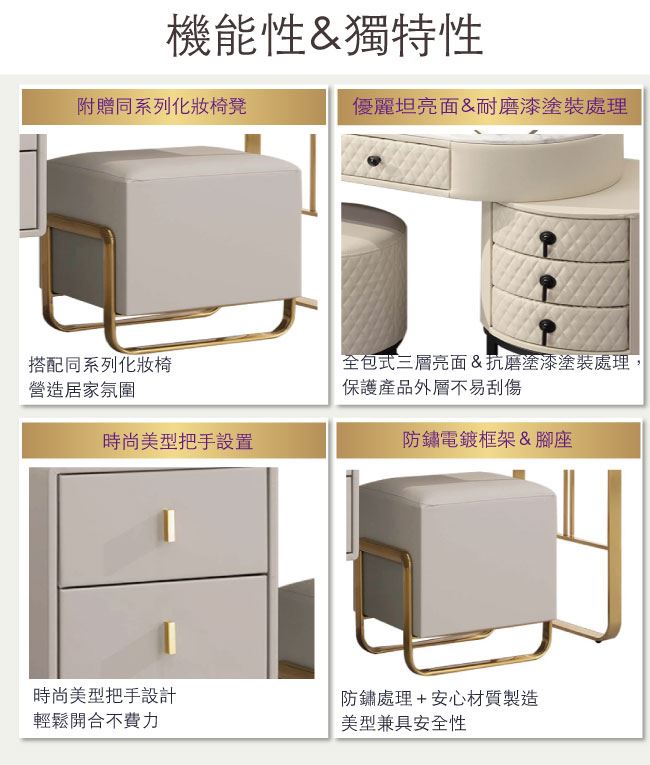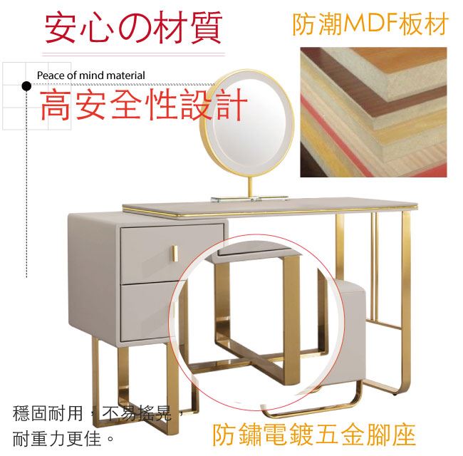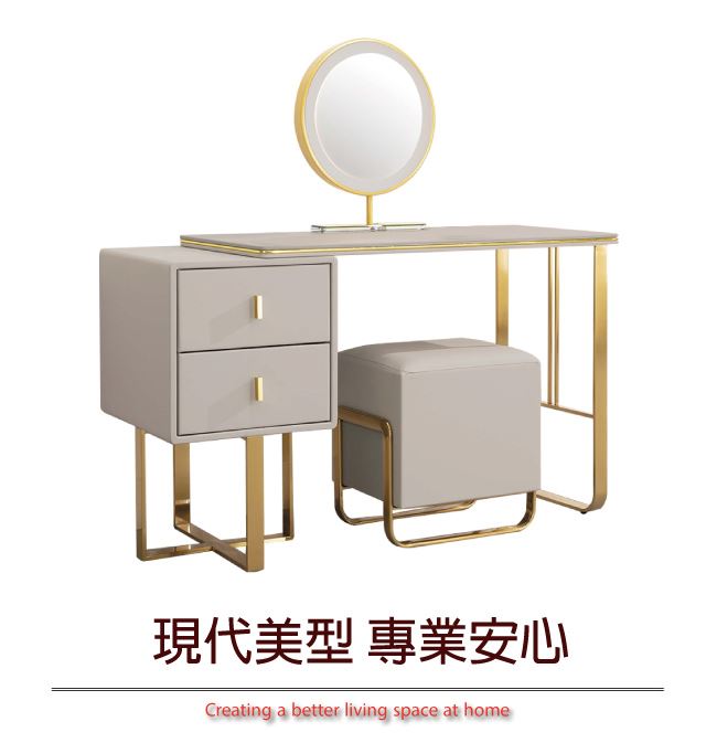 商品 介紹 | 【綠家居】伊格納 奢華風3.3尺皮革立鏡式鏡台/化妝台組合(含化妝椅) 奢華淺灰色系+現代美型風格+安心材質製造,鏡台整體採用防潮MDF板材+防鏽電鍍腳座+柔韌菱格紋皮革等安心材質製造,鏡台桌面&收納櫃可自由調整左&右二向擺設,可依居家實際裝潢位置擺放搭配固定式鏡面櫃+二抽屜+開放式收納等收納設計,全由專人配送到家,專業安心服務,替你省下更多時間! 【商品特色】 奢華淺灰色系+現代美型風格+安心材質製造,使用放心+搭配居家更便利 鏡台採用防潮MDF板材+防鏽電鍍腳座+柔韌菱格紋皮革等安心材質製造 搭配固定式鏡面櫃+二抽屜+開放式收納等收納設計 鏡台桌面&收納櫃可自由調整左&右二向擺設,可依居家實際裝潢位置擺放 此商品不需要DIY組立,此商品為組立後之成品 品質保證、專業設計、貼心服務 全由專人配送到家,專業安心服務,替您省下更多時間 |