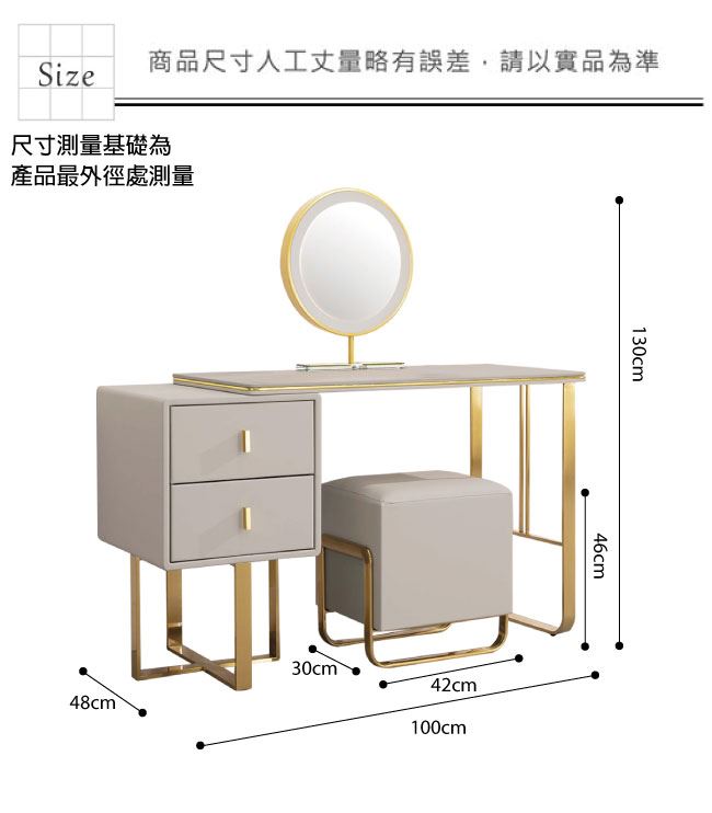 材質 | ◆產品名稱: 【綠家居】伊格納 奢華風3.3尺皮革立鏡式鏡台/化妝台組合(含化妝椅) 產品尺寸: 尺寸:(寬)100x(深)48x(高)130/公分 ◆材質: 材質:防潮MDF板材+防鏽電鍍腳座+柔韌菱格紋皮革 材質:五金滑軌結構+強化玻璃鏡面