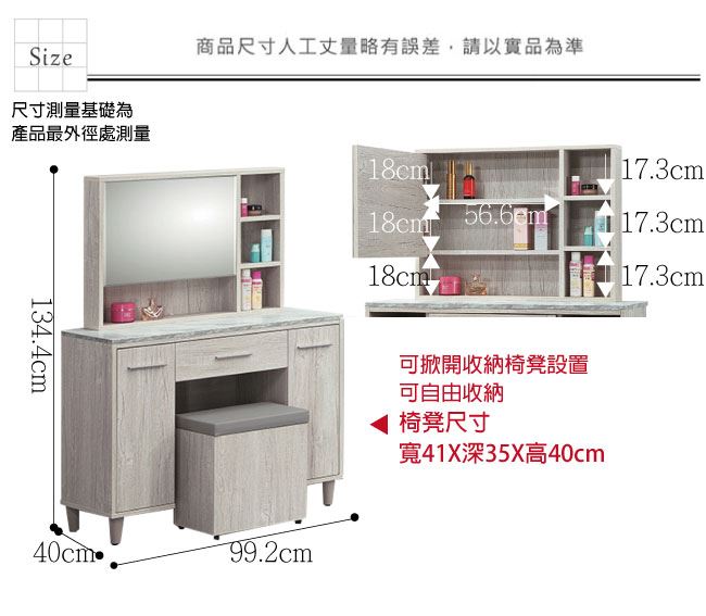 材質 | ◆產品名稱: 【綠家居】巴菲 淺橡3.3尺開合式鏡台/化妝台組合(含化妝椅) 產品尺寸: 尺寸:(寬)99.2x(深)40x(高)134.4/公分 ◆材質: 材質:防蛀木心板+防潮耐磨腳座 材質:五金滑軌結構+強化玻璃鏡面 塗漆:優利坦全包式耐磨噴漆處理