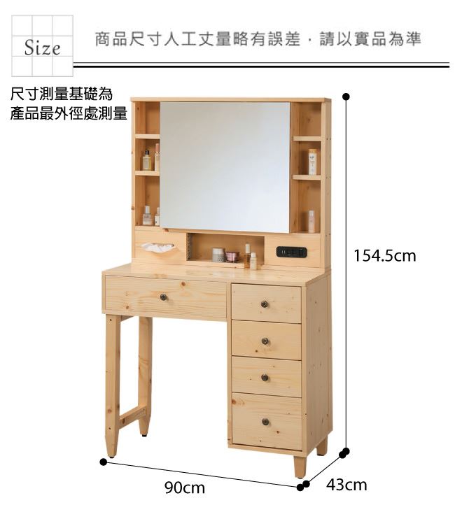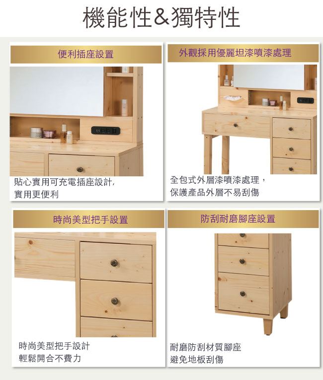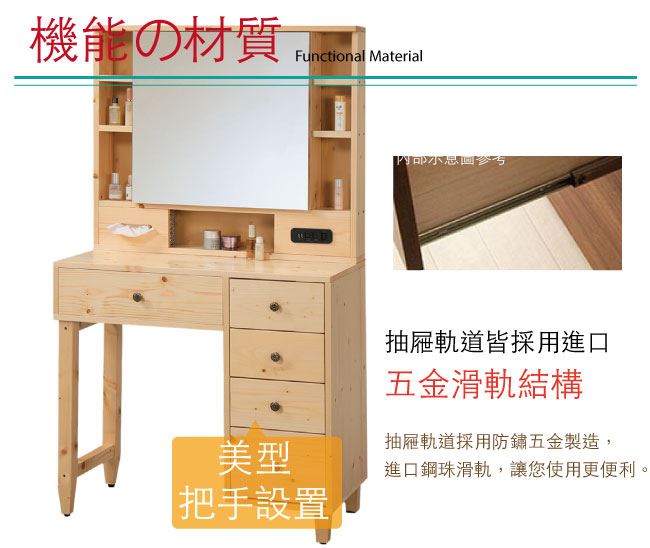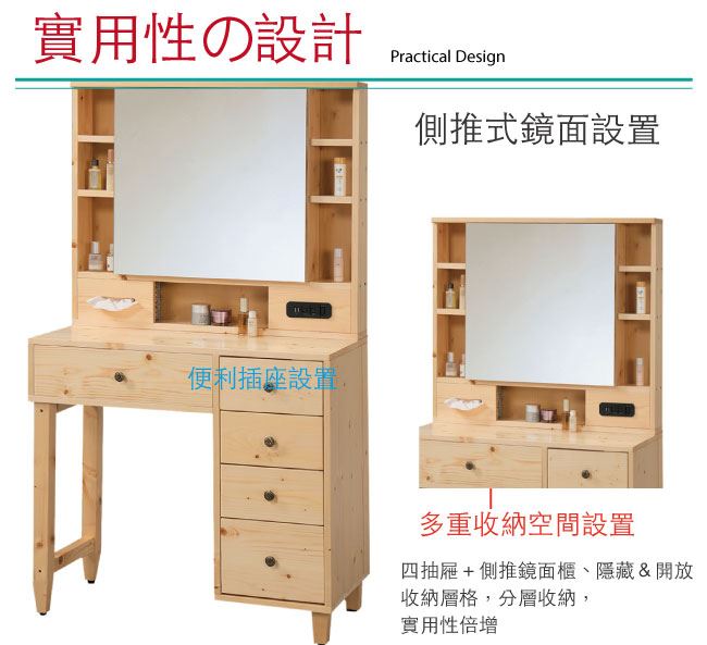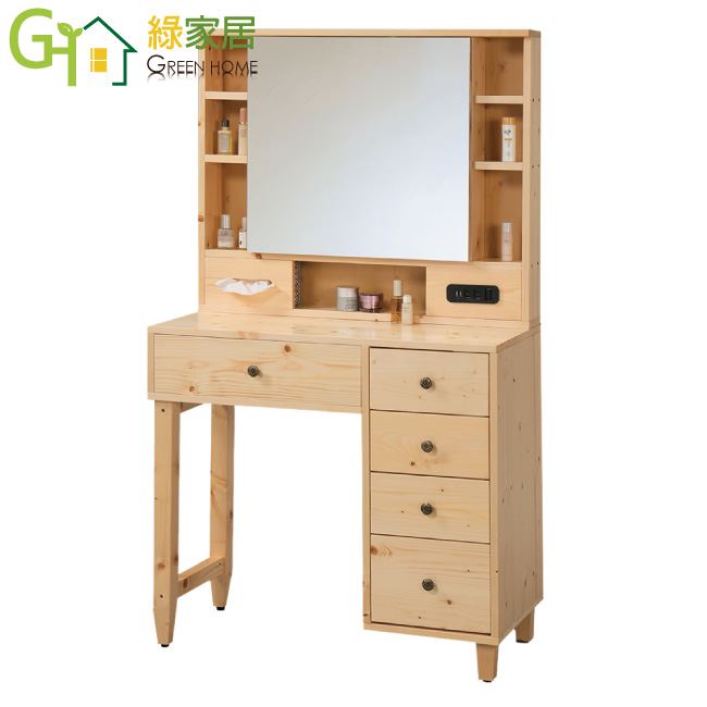 商品 介紹 | 【綠家居】歐萊 現代3尺實木側推式鏡台/化妝台組合(附插座) 松木紋色系+現代簡約風格+安心材質製造,鏡台整體採用松木實木+防蛀木心板+五金滑軌結構+強化玻璃鏡面+防潮耐磨腳座等安心材質製造,外層採用優利坦全包式耐磨噴漆處理搭配側推式鏡面櫃+五抽屜+附便利插座+開放式&隱藏式收納等收納設計,全由專人配送到家,專業安心服務,替你省下更多時間! 【商品特色】 松木紋色系+現代簡約風格+安心材質製造,使用放心+搭配居家更便利 鏡台採用松木實木+防蛀木心板+五金滑軌結構+強化玻璃鏡面+防潮耐磨腳座等安心材質製造 側推式鏡面櫃+五抽屜+附便利插座+開放式&隱藏式收納等收納設計 此商品不需要DIY組立,此商品為組立後之成品 品質保證、專業設計、貼心服務 全由專人配送到家,專業安心服務,替您省下更多時間 |