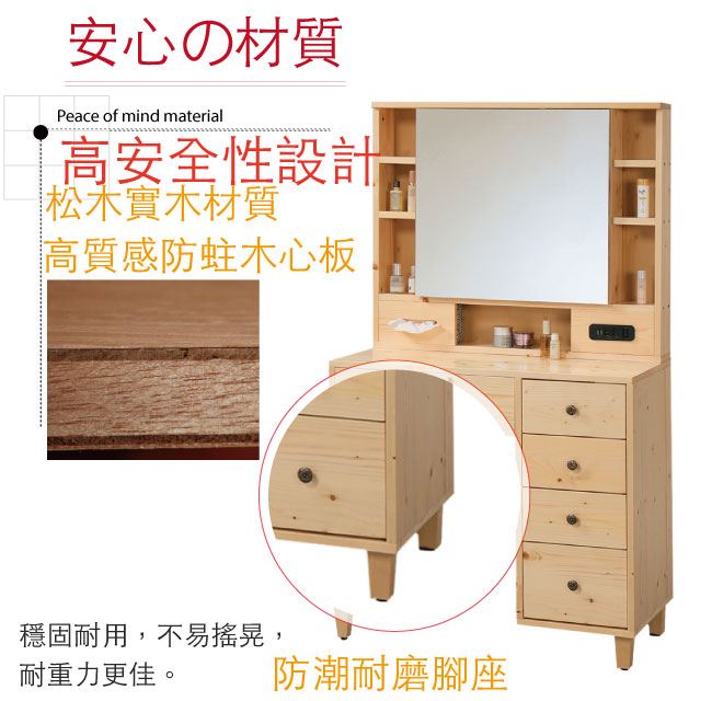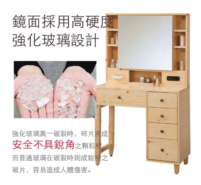 材質 | ◆產品名稱: 【綠家居】歐萊 現代3尺實木側推式鏡台/化妝台組合(附插座) 產品尺寸: 尺寸:(寬)90x(深)43x高)154.5/公分 ◆材質: 材質:松木實木+防蛀木心板+防潮耐磨腳座 材質:五金滑軌結構+強化玻璃鏡面 塗漆:優利坦全包式耐磨噴漆處理