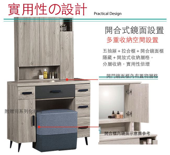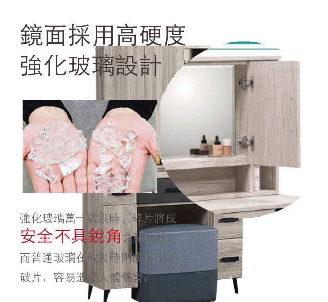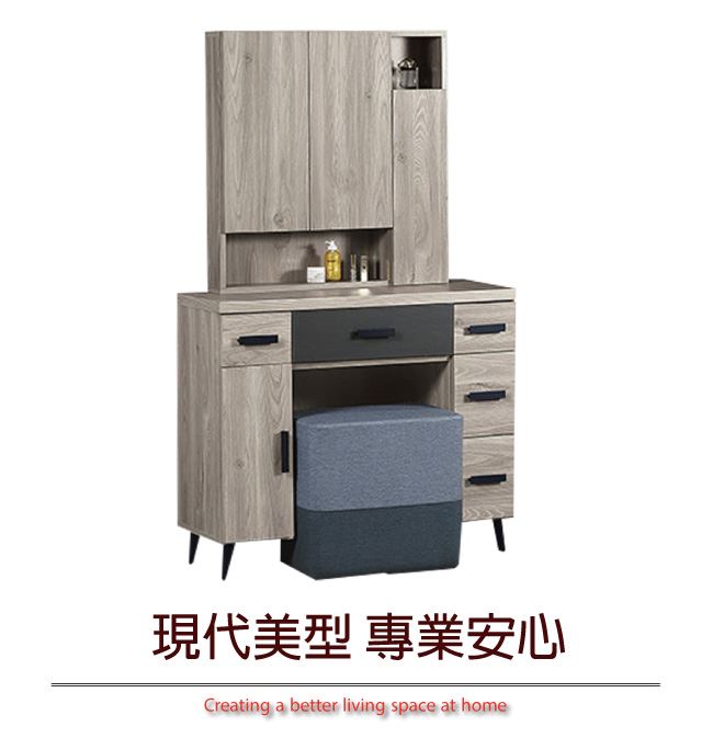 商 品 介 紹 | 【綠家居】佩芮 時尚3.3尺開合式鏡台/化妝台組合(含化妝椅) 橡木紋色+現代簡約風格+安心材質製造,鏡台整體採用防蛀木心板+五金滑軌結構+強化玻璃鏡面+防鏽黑漆腳座等安心材質製造,外層採用優利坦全包式耐磨噴漆處理搭配開合式鏡面櫃+五抽屜+開門櫃+開放式收納等收納設計,全由專人配送到家,專業安心服務,替你省下更多時間! 【商品特色】 橡木紋色+現代簡約風格+安心材質製造,使用放心+搭配居家更便利 鏡台採用防蛀木心板+五金滑軌結構+強化玻璃鏡面+防鏽黑漆腳座等安心材質製造 開合式鏡面櫃+五抽屜+開門櫃+開放式收納等收納設計 此商品不需要DIY組立,此商品為組立後之成品 品質保證、專業設計、貼心服務 全由專人配送到家,專業安心服務,替您省下更多時間 |