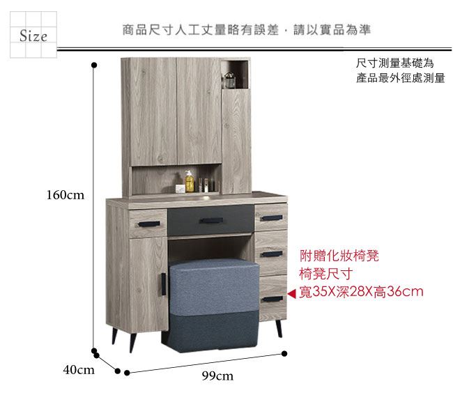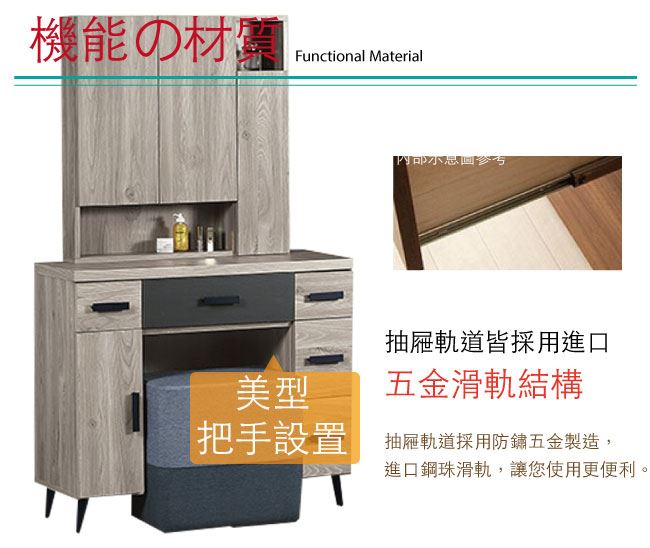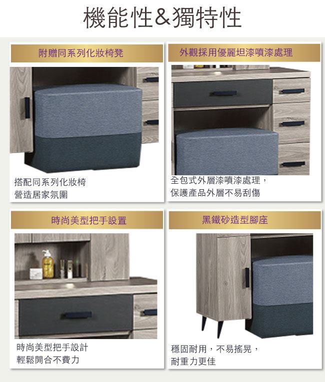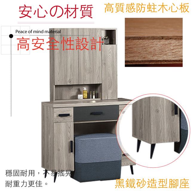 材質 | ◆產品名稱: 【綠家居】佩芮 時尚3.3尺開合式鏡台/化妝台組合(含化妝椅) 產品尺寸: 尺寸:(寬)99x(深)40x(高)160/公分 ◆材質: 材質:防蛀木心板+防鏽黑漆腳座 材質:五金滑軌結構+強化玻璃鏡面 塗漆:優利坦全包式耐磨噴漆處理