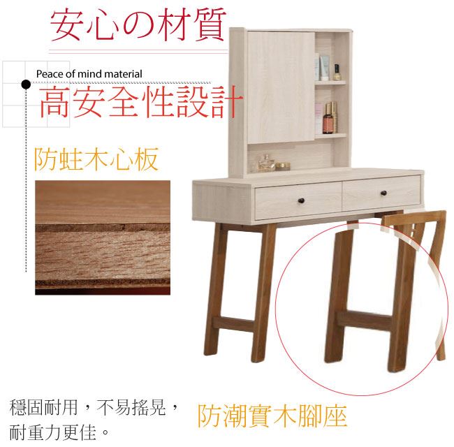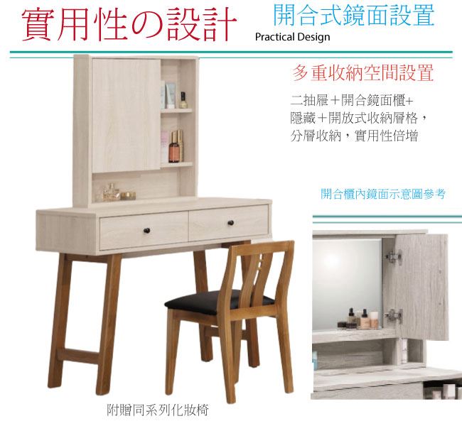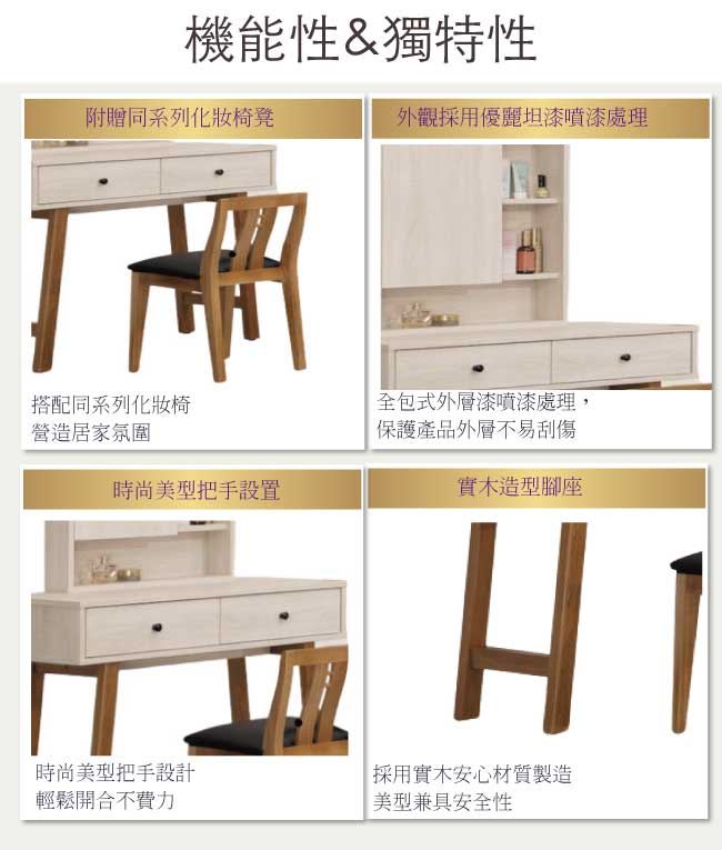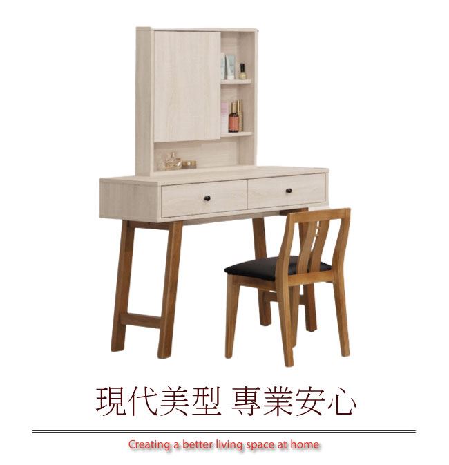 商 品 介 紹 | 【綠家居】比查特 雙色3.2尺開合式鏡台/化妝台組合(含化妝椅) 橡木紋雙色系+現代簡約風格+安心材質製造,鏡台整體採用防蛀木心板+五金滑軌結構+強化玻璃鏡面+防潮實木腳座等安心材質製造,外層採用優利坦全包式耐磨噴漆處理搭配開合式鏡面櫃+二抽屜+開放&隱藏式收納等收納設計,全由專人配送到家,專業安心服務,替你省下更多時間! 【商品特色】 橡木紋雙色系+現代簡約風格+安心材質製造,使用放心+搭配居家更便利 鏡台採用防蛀木心板+五金滑軌結構+強化玻璃鏡面+防潮實木腳座等安心材質製造 開合式鏡面櫃+二抽屜+開放&隱藏式收納等收納設計 此商品不需要DIY組立,此商品為組立後之成品 品質保證、專業設計、貼心服務 全由專人配送到家,專業安心服務,替您省下更多時間