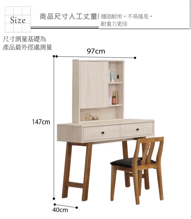 產品名稱:【綠家居】比查特 雙色3.2尺開合式鏡台/化妝台組合(含化妝椅) 產品尺寸: 尺寸:(寬)97x(深)40x(高)147/公分 ◆材質: 材質:防蛀木心板+防潮實木腳座 材質:五金滑軌結構+強化玻璃鏡面 塗漆:優利坦全包式耐磨噴漆處理