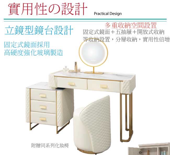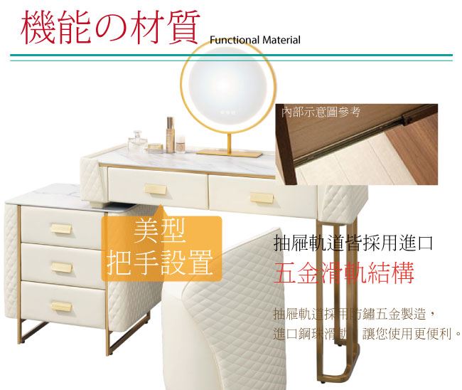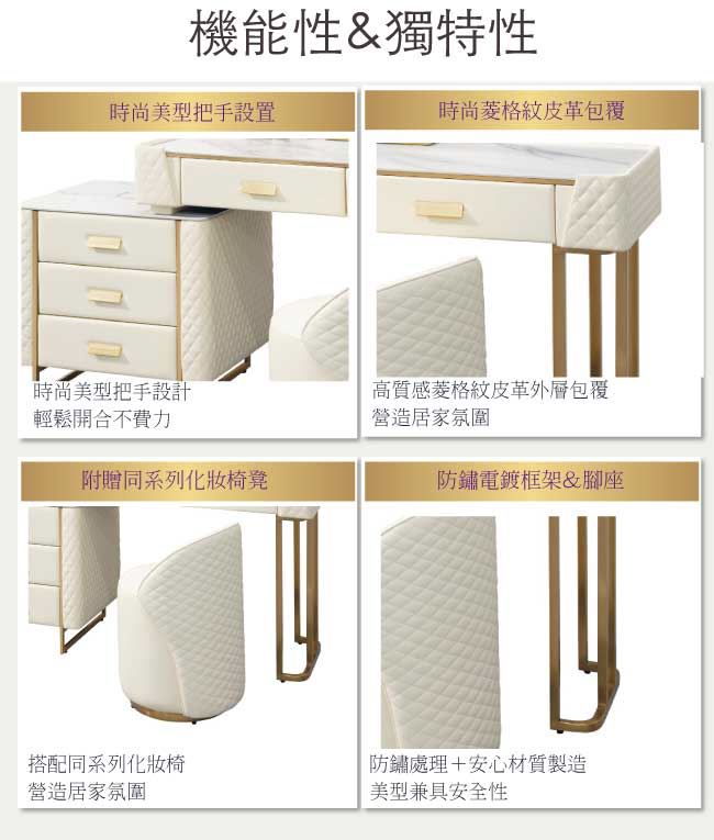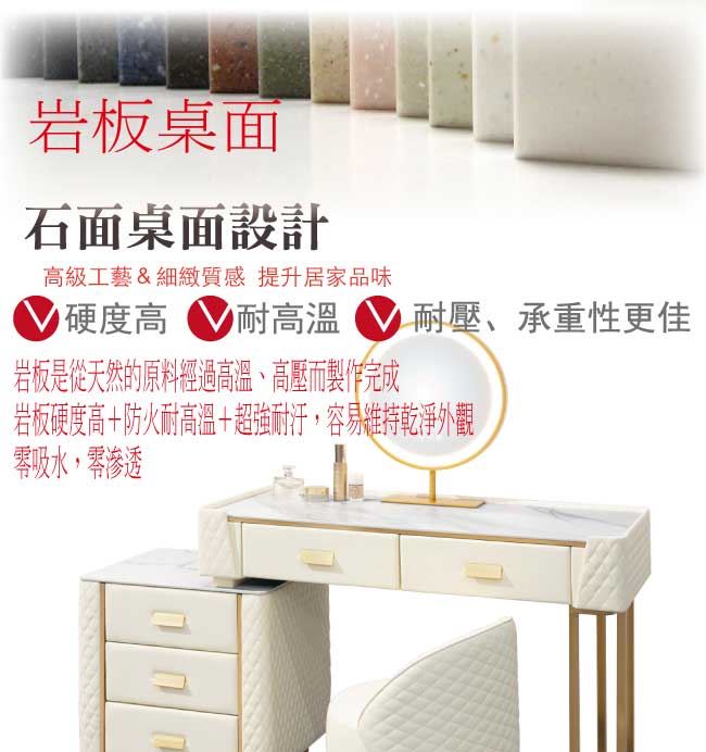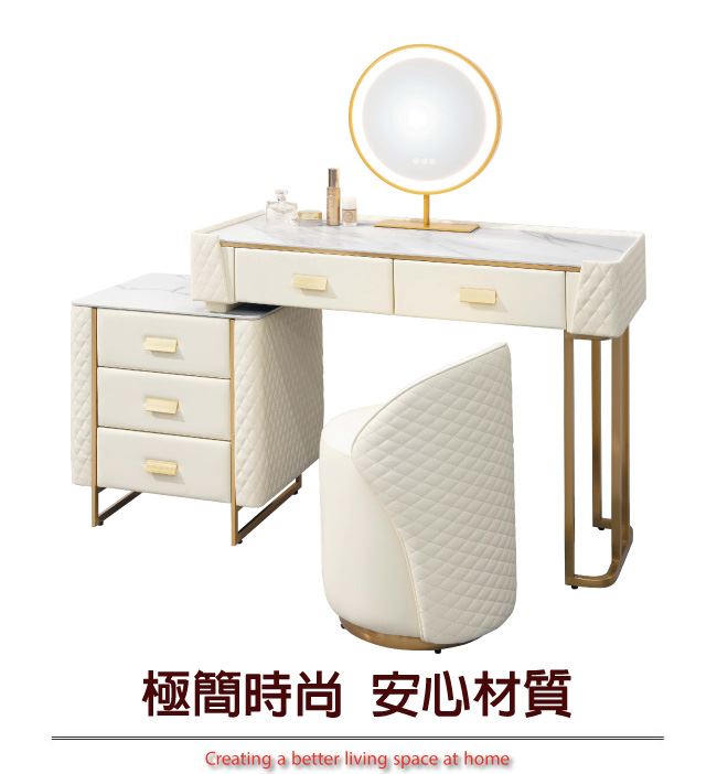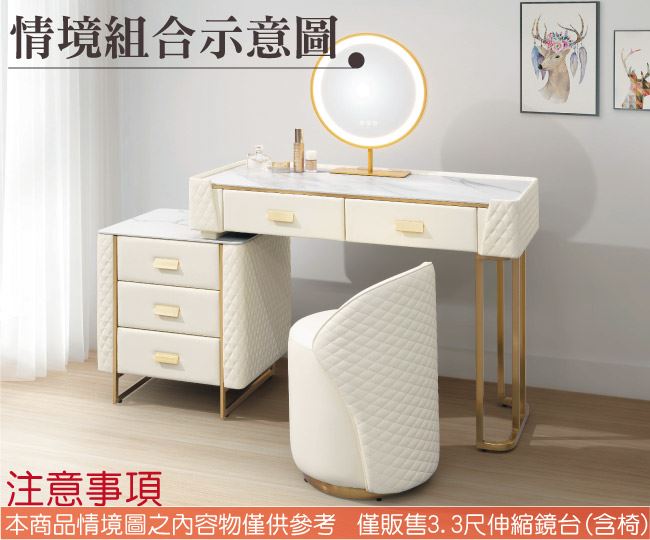 商 品 介 紹 | 【綠家居】魁北克3.3尺皮革岩板伸縮化妝台/鏡台(含化妝椅) 奢華米白色系+現代簡約風格+安心材質製造,整體採用防潮MDF板材+防鏽金漆腳座+五金滑軌結構+強化玻璃鏡面+透氣PU皮革+6mm高硬度岩板桌面板等安心材質製造,產品外層採用防潮亮面噴漆處理搭配採用固定式鏡面+五抽屜+LED鏡面燈+鏡面櫃&抽屜櫃可伸縮橫移調整等收納空間設計,全由專人配送到家,專業安心服務,替你省下更多時間! 【商品特色】 奢華米白色系+現代簡約風格+安心材質製造,使用放心+搭配居家更便利 採用防潮MDF板材+防鏽金漆腳座+五金滑軌結構+強化玻璃鏡面+透氣PU皮革+6mm高硬度岩板桌面板等安心材質製造 產品外層採用防潮亮面噴漆處理 搭配採用固定式鏡面+五抽屜+LED鏡面燈+鏡面櫃&抽屜櫃可伸縮橫移調整等收納空間設計 此商品不需要DIY組立,此商品為組立後之成品 品質保證、專業設計、貼心服務 全由專人配送到家,專業安心服務,替您省下更多時間 |