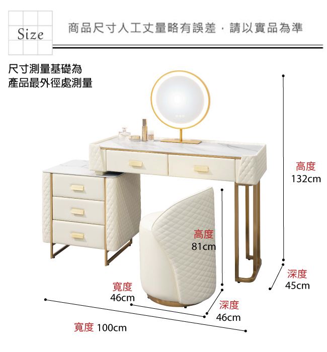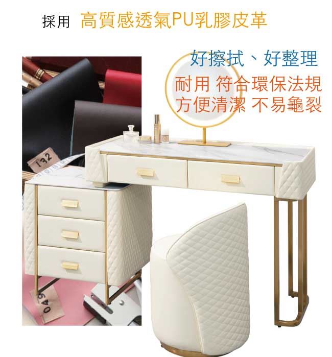 材質 | ◆產品名稱:【綠家居】魁北克3.3尺皮革岩板伸縮化妝台/鏡台(含化妝椅) 尺寸:(寬)100x(深)45(高)132/公分 ◆材質: 材質:防潮MDF板材+防鏽金漆腳座+五金滑軌結構+強化玻璃鏡面+透氣PU皮革+6mm高硬度岩板桌面板 噴漆:防潮亮面噴漆處理