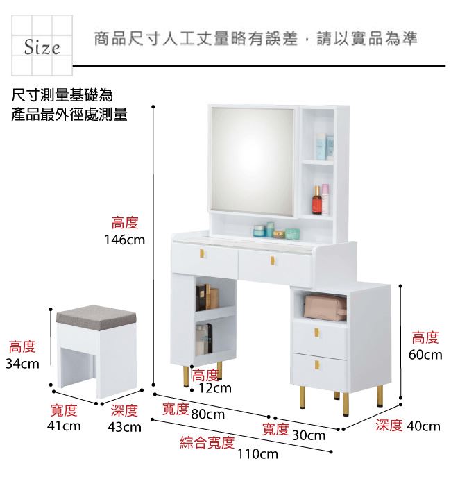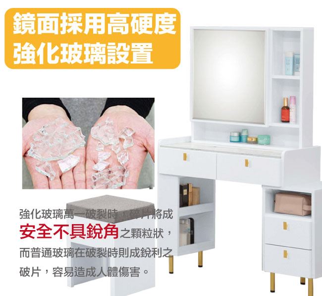 材質 | ◆產品名稱:【綠家居】溫荷克輕奢白3.7尺開合鏡面伸縮鏡台/化妝台組合(含化妝椅) 鏡台尺寸:(寬)80x(深)40(高)146/公分 二抽櫃尺寸:(寬)30x(深)40(高)60/公分 組合尺寸:(寬)110x(深)40(高)146/公分 ◆材質: 材質:防潮MDF板材+防鏽金漆腳座+五金滑軌結構+強化玻璃鏡面 噴漆:防潮亮面噴漆處理