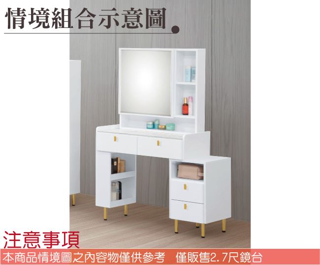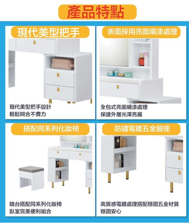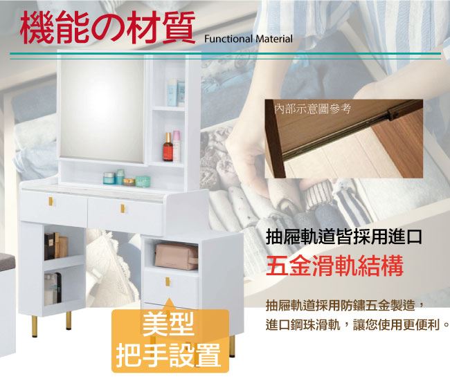 商 品 介 紹 | 【綠家居】溫荷克輕奢白3.7尺開合鏡面伸縮鏡台/化妝台組合(含化妝椅) 輕奢白色系+現代簡約風格+安心材質製造,整體採用防潮MDF板材+防鏽金漆腳座+五金滑軌結構+強化玻璃鏡面等安心材質製造,產品外層採用防潮亮面噴漆處理搭配採用開合鏡面櫃+四抽屜+開放&隱藏式收納等收納空間設計,全由專人配送到家,專業安心服務,替你省下更多時間! 【商品特色】 輕奢白色系+現代簡約風格+安心材質製造,使用放心+搭配居家更便利 鏡台&二抽櫃的組合,櫃身可伸縮橫移擺設,增加居家擺設的便利性 採用防潮MDF板材+防鏽金漆腳座+五金滑軌結構+強化玻璃鏡面等安心材質製造 產品外層採用防潮亮面噴漆處理 搭配採用開合鏡面櫃+四抽屜+開放&隱藏式收納等收納空間設計 此商品不需要DIY組立,此商品為組立後之成品 品質保證、專業設計、貼心服務 全由專人配送到家,專業安心服務,替您省下更多時間 |