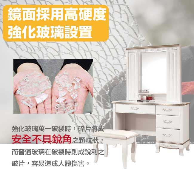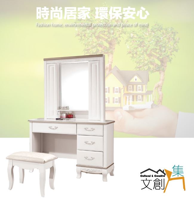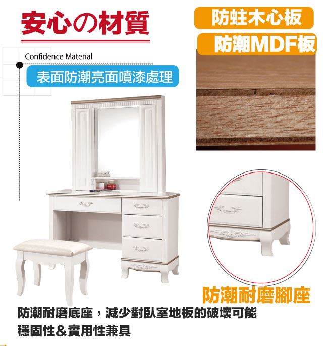 商 品 介 紹 | 【綠家居】帝伊新古典白3.5尺固定式鏡台/化妝台組合(鏡台+化妝椅) 新古典白色系+現代輕奢典雅風格+安心材質製造,整體採用松木實木+防蛀木心板+防潮MDF板材+防潮耐磨腳座+五金滑軌結構+強化玻璃鏡面等安心材質製造,產品外層採用防潮亮面噴漆處理搭配採用固定式鏡面櫃+開門櫃+四抽屜+開放式層格等收納空間設計,全由專人配送到家,專業安心服務,替你省下更多時間! 【商品特色】 新古典白色系+現代輕奢典雅風格+安心材質製造,使用放心+搭配居家更便利 採用松木實木+防蛀木心板+防潮MDF板材+防潮耐磨腳座+五金滑軌結構+強化玻璃鏡面等安心材質製造 產品外層採用防潮亮面噴漆處理 採用固定式鏡面櫃+開門櫃+四抽屜+開放式層格等收納空間設計 此商品不需要DIY組立,此商品為組立後之成品 品質保證、專業設計、貼心服務 全由專人配送到家,專業安心服務,替您省下更多時間 |