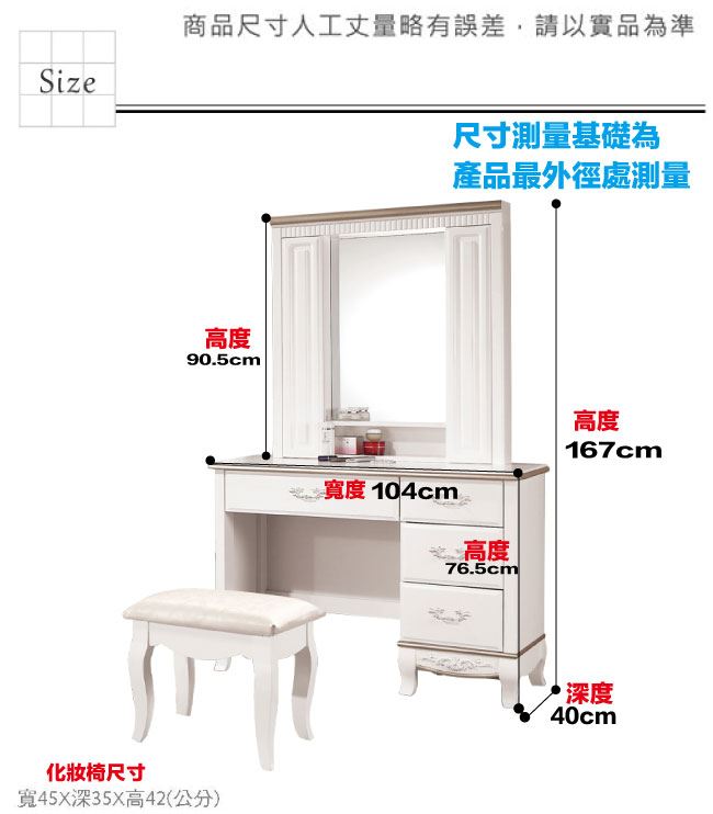 材質 | ◆產品名稱:【綠家居】帝伊新古典白3.5尺固定式鏡台/化妝台組合(鏡台+化妝椅) 鏡台尺寸:(寬)104x(深)40(高)167/公分 化妝椅尺寸:(寬)45x(深)35(高)42/公分 ◆材質: 材質:松木實木+防蛀木心板+防潮MDF板材+防潮耐磨腳座+五金滑軌結構+強化玻璃鏡面 噴漆:防潮亮面噴漆處理