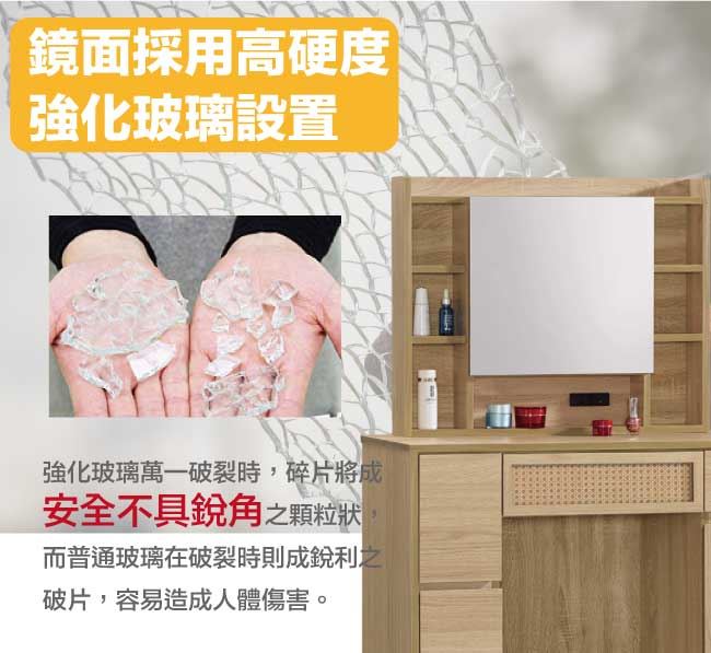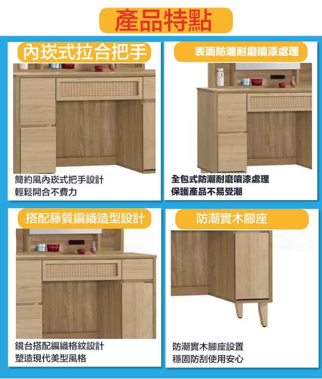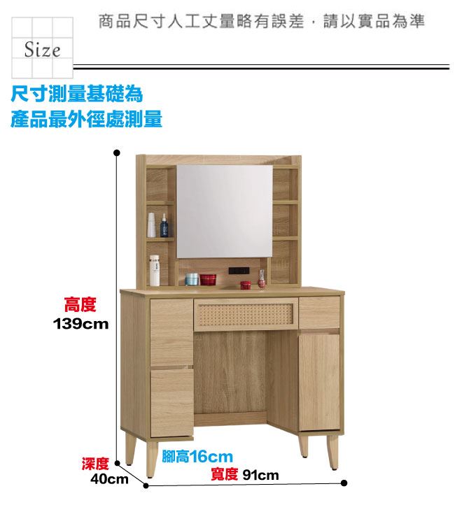 材質 | ◆產品名稱:【綠家居】神奈川編織紋3尺開合式鏡面化妝台/鏡台(不含化妝椅) 尺寸:(寬)91x(深)40(高)139/公分 ◆材質: 材質:防蛀木心板+防潮實木腳座+五金滑軌結構+藤質編織網格+強化玻璃鏡面 噴漆:防潮耐磨噴漆處理