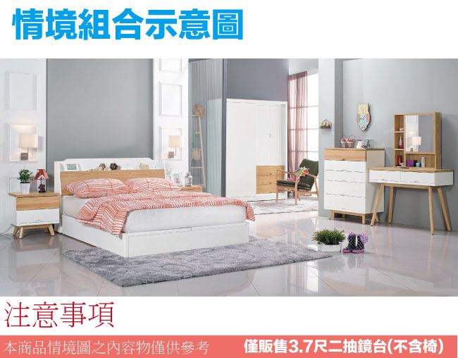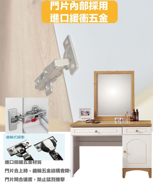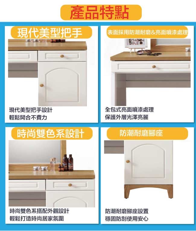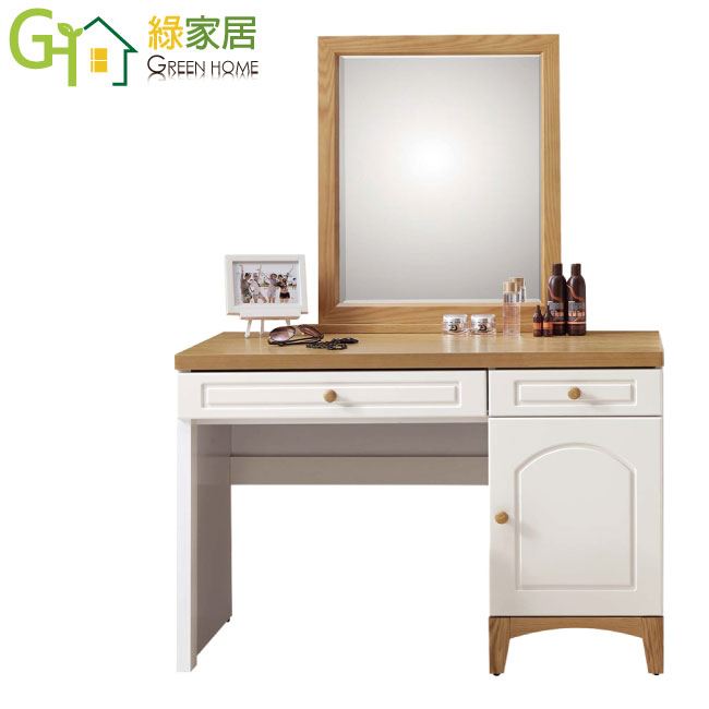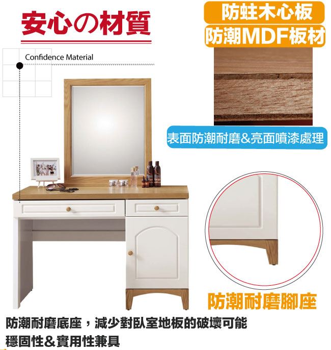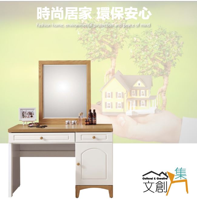 商 品 介 紹 | 【綠家居】路可雙色3.7尺固定式鏡面化妝台/鏡台(不含化妝椅) 木紋雙色系+現代簡約風格+安心材質製造,使用放心+搭配居家更便利,整體採用防蛀木心板+防潮MDF板材+防潮耐磨腳座+五金滑軌結構+強化玻璃鏡面等材質搭配外層採用優莉坦耐磨&亮面全包式噴漆處理 ,採用固定式鏡面+開門櫃+二抽屜+開放式收納等收納空間設計,全由專人配送到家,專業安心服務,替你省下更多時間! 【商品特色】 木紋雙色系+現代簡約風格+安心材質製造,使用放心+搭配居家更便利 防蛀木心板+防潮MDF板材+防潮耐磨腳座+五金滑軌結構+強化玻璃鏡面等材質 採用固定式鏡面+開門櫃+二抽屜+開放式收納等收納空間設計 此商品不需要DIY組立,此商品為組立後之成品 品質保證、專業設計、貼心服務 全由專人配送到家,專業安心服務,替您省下更多時間 |