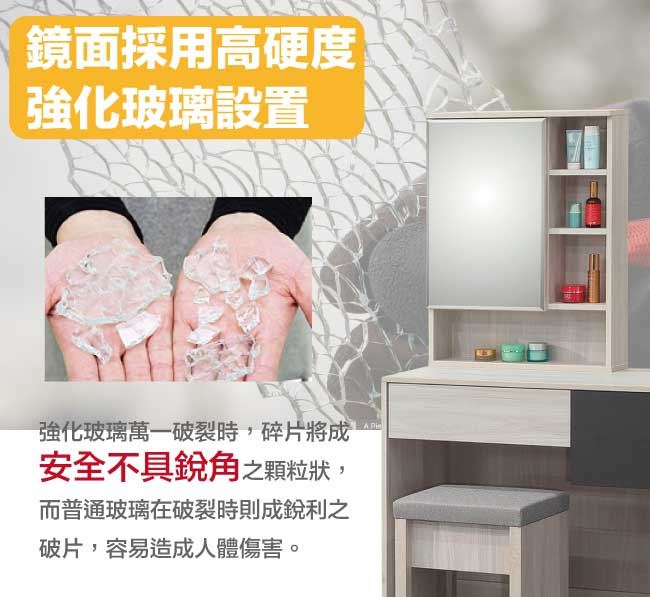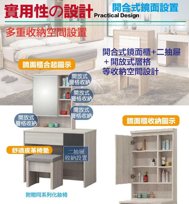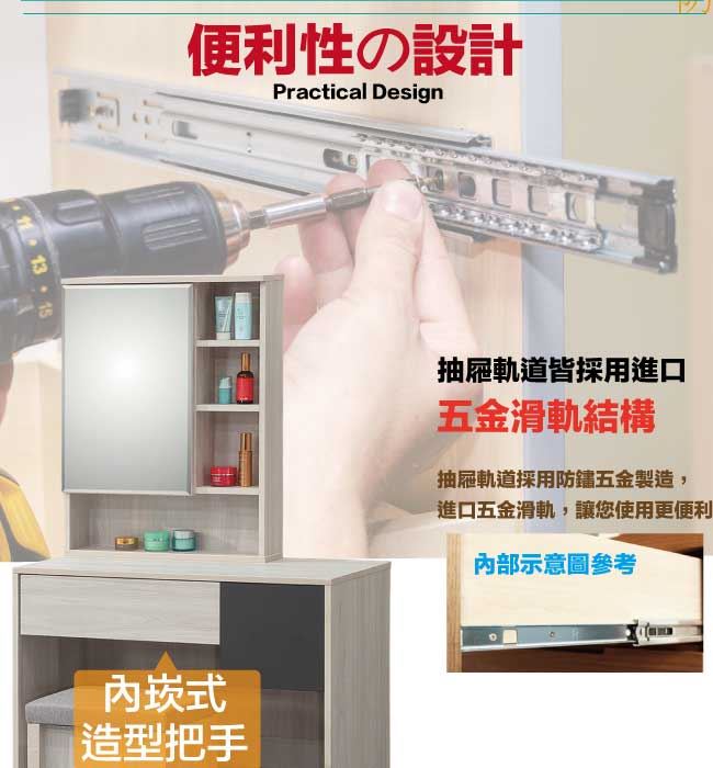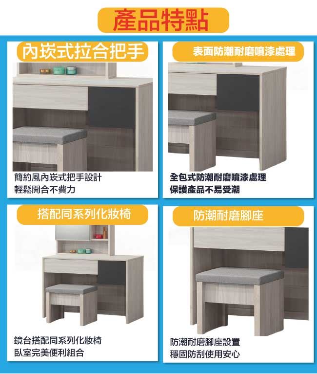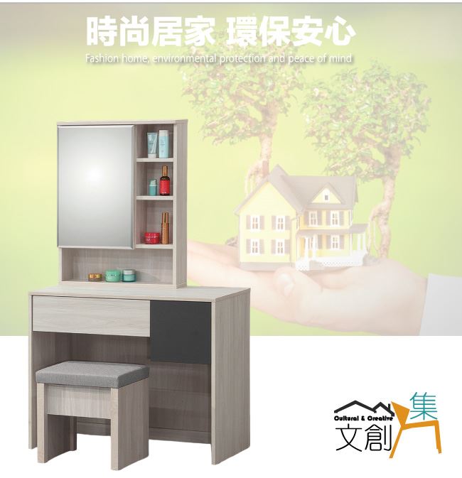 商 品 介 紹 | 【綠家居】路多雙色3尺開合式鏡面化妝台/鏡台組合(含化妝椅) 淺橡木紋雙色+現代簡約風格+安心材質製造,使用放心+搭配居家更便利,整體採用防蛀木心板+防潮耐磨腳座+五金滑軌結構+強化玻璃鏡面等材質搭配外層採用優莉坦耐磨全包式噴漆處理 ,採用開合式鏡面櫃+二抽屜+開放式收納等收納空間設計,全由專人配送到家,專業安心服務,替你省下更多時間! 【商品特色】 淺橡木紋雙色+現代簡約風格+安心材質製造,使用放心+搭配居家更便利 防蛀木心板+防潮耐磨腳座+五金滑軌結構+強化玻璃鏡面等材質 採用開合式鏡面櫃+二抽屜+開放式收納等收納空間設計 此商品不需要DIY組立,此商品為組立後之成品 品質保證、專業設計、貼心服務 全由專人配送到家,專業安心服務,替您省下更多時間 |