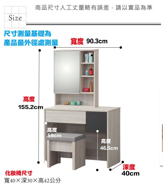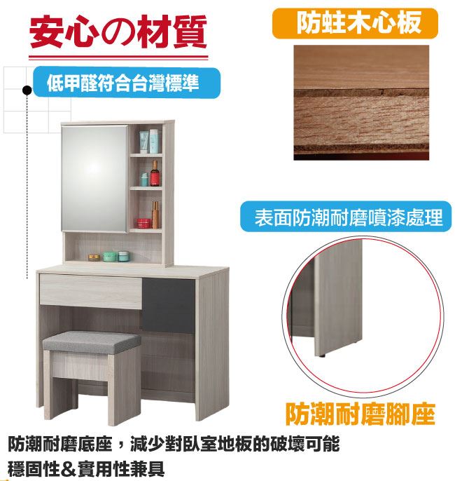 材質 | ◆產品名稱:【綠家居】路多雙色3尺開合式鏡面化妝台/鏡台組合(含化妝椅) 尺寸:(寬)90.3x(深)40(高)155.2/公分 ◆材質: 材質:防蛀木心板+防潮耐磨腳座+五金滑軌結構+強化玻璃鏡面 噴漆:防潮耐磨噴漆處理