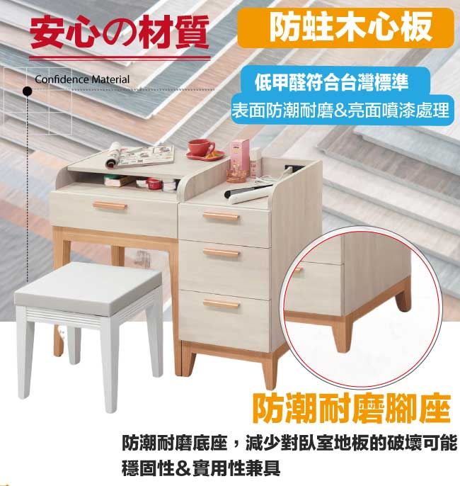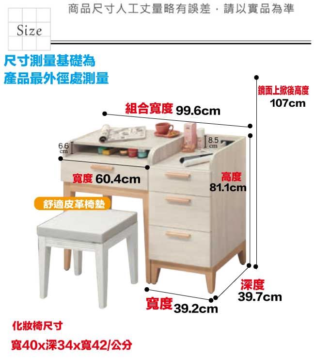 材質 | ◆產品名稱:【綠家居】路卡雙色3.3尺上掀式鏡面化妝台/鏡台組合(含化妝椅+桌面附設充電插座) 尺寸:(寬)99.6x(深)39.7(高)81.1/公分 ◆材質: 材質:防蛀木心板+防潮耐磨腳座+五金滑軌結構+強化玻璃鏡面 噴漆:防潮耐磨噴漆處理
