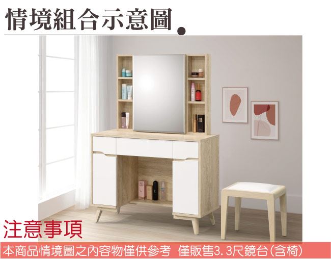 商 品 介 紹 | 【綠家居】亞果雙色3.3尺側推式鏡面鏡台組合(含化妝椅) 橡木紋雙色系+現代簡約風格+安心材質製造,使用放心+搭配居家更便利,整體採用防蛀木心板+松木實木+防潮MDF板材+防潮實木腳座+五金滑軌結構+強化玻璃鏡面等材質搭配外層採用優莉坦耐磨全包式噴漆處理 ,採用側推式鏡面櫃+三抽屜+拉合收納櫃+開放層格等收納空間設計,全由專人配送到家,專業安心服務,替你省下更多時間! 【商品特色】 橡木紋雙色系+現代簡約風格+安心材質製造,使用放心+搭配居家更便利 此組鏡台組合含可收納化妝椅搭配,化妝椅座墊可掀起內含收納層格可用來置放私人物品,增加實用機能性 防蛀木心板+松木實木+防潮MDF板材+防潮實木腳座+五金滑軌結構+強化玻璃鏡面等材質 採用側推式鏡面櫃+三抽屜+拉合收納櫃+開放層格等收納空間設計 此商品不需要DIY組立,此商品為組立後之成品 品質保證、專業設計、貼心服務 全由專人配送到家,專業安心服務,替您省下更多時間 |