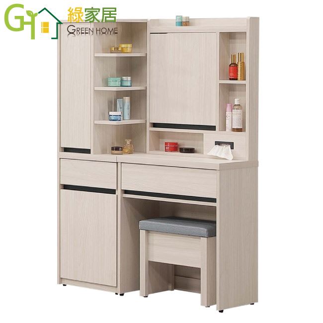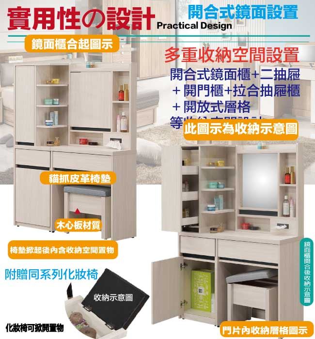 【綠家居】亞卡3.3尺開合式鏡面鏡台組合(鏡台+側邊櫃+含化妝椅)