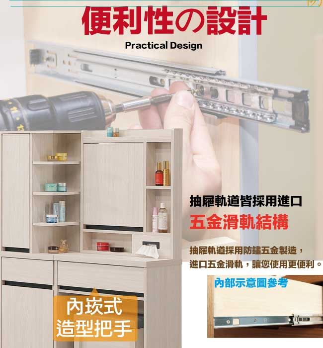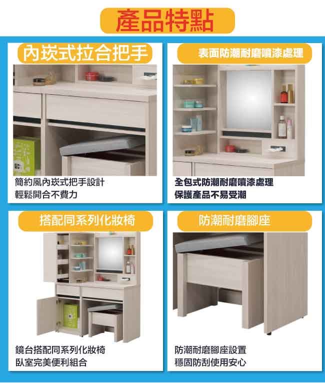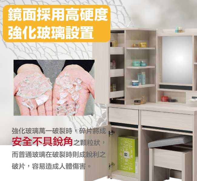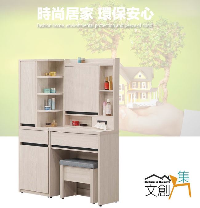 商 品 介 紹 | 【綠家居】亞卡3.3尺開合式鏡面鏡台組合(鏡台+側邊櫃+含化妝椅) 淺橡木紋色系+現代簡約風格+安心材質製造,使用放心+搭配居家更便利,整體採用防蛀木心板+防潮耐磨腳座+五金滑軌結構+強化玻璃鏡面等材質搭配外層採用優莉坦耐磨全包式噴漆處理 ,採用開合式鏡面櫃+開門櫃+二抽屜+拉合抽屜櫃+開放式收納等收納空間設計,全由專人配送到家,專業安心服務,替你省下更多時間! 【商品特色】 淺橡木紋色系+現代簡約風格+安心材質製造,使用放心+搭配居家更便利 此組鏡台組合含可收納化妝椅搭配,化妝椅座墊可掀起內含收納層格可用來置放私人物品,增加實用機能性 防蛀木心板+防潮耐磨腳座+五金滑軌結構+強化玻璃鏡面等材質 採用開合式鏡面櫃+開門櫃+二抽屜+拉合抽屜櫃+開放式收納等收納空間設計 此商品不需要DIY組立,此商品為組立後之成品 品質保證、專業設計、貼心服務 全由專人配送到家,專業安心服務,替您省下更多時間 |