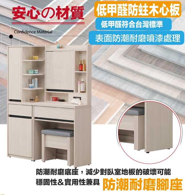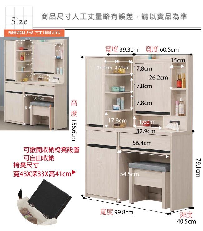 材質 | ◆產品名稱:【綠家居】亞卡3.3尺開合式鏡面鏡台組合(鏡台+側邊櫃+含化妝椅) 尺寸:(寬)99.8x(深)40.5(高)156.6/公分 ◆材質: 材質:防蛀木心板+防潮耐磨腳座+五金滑軌結構+強化玻璃鏡面 噴漆:防潮耐磨噴漆處理